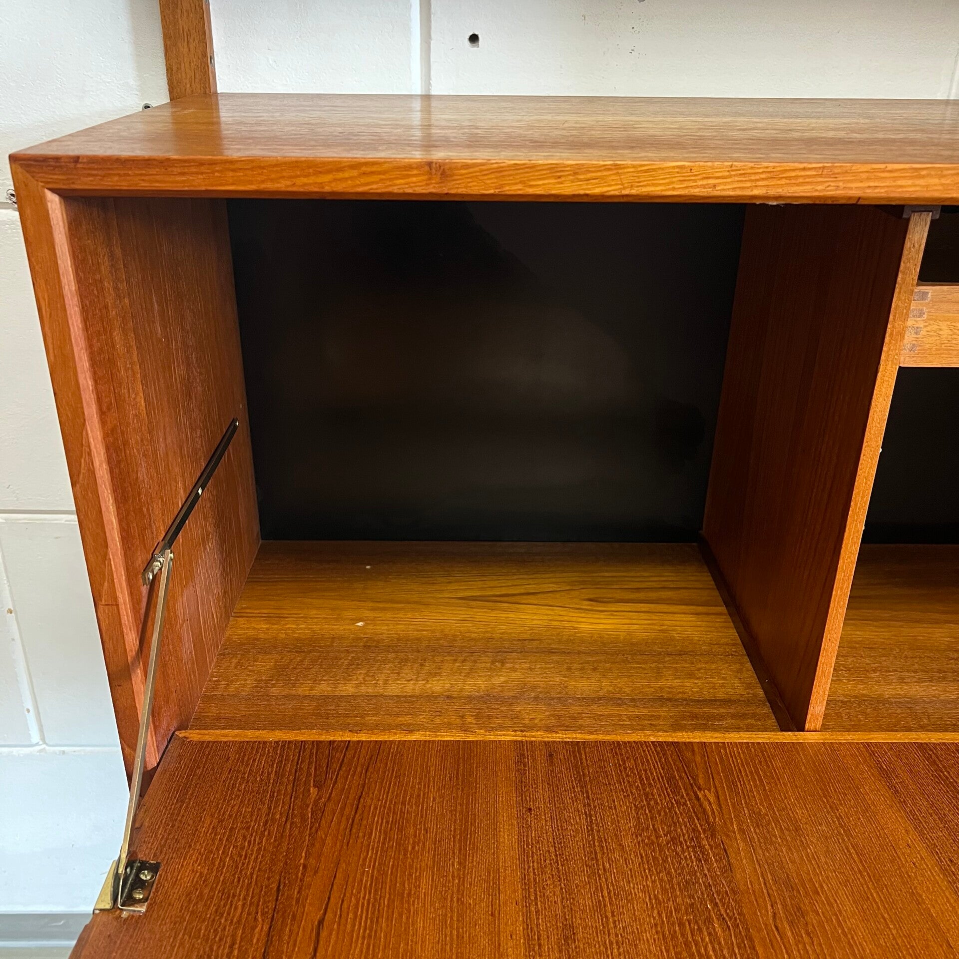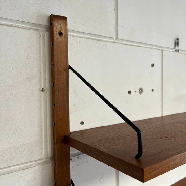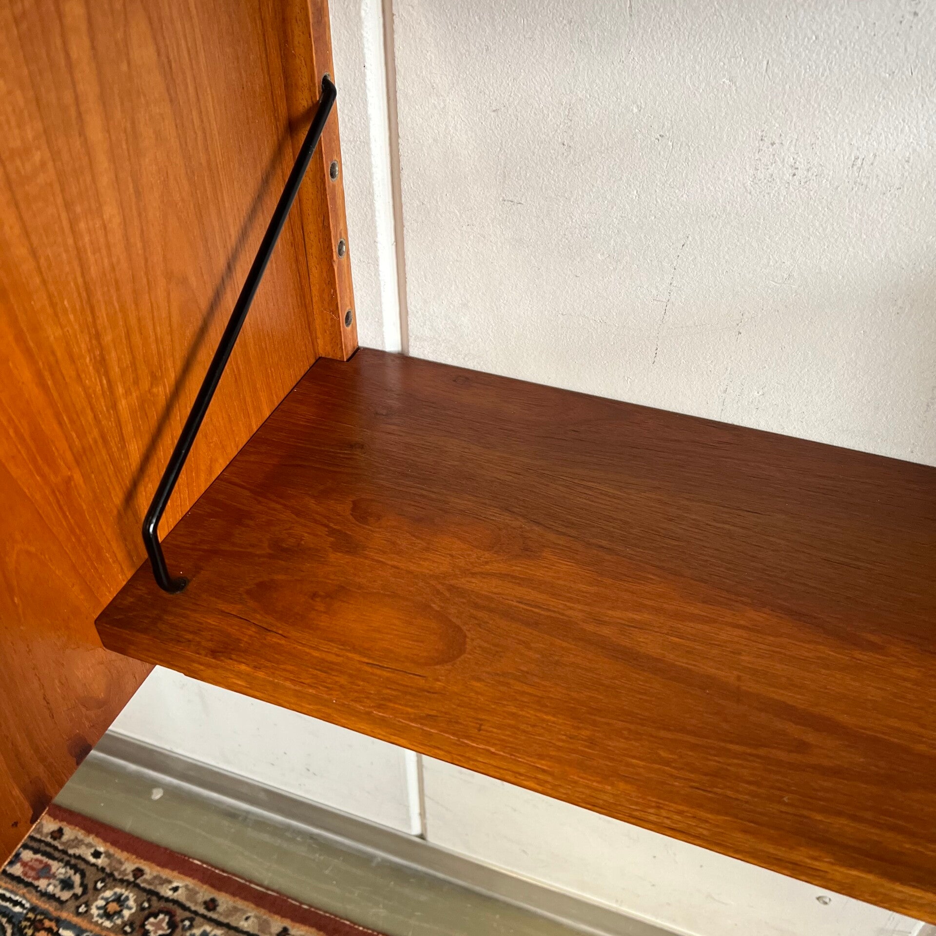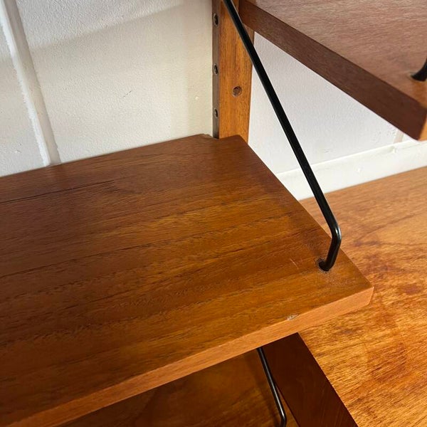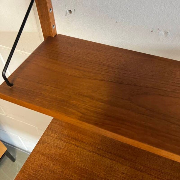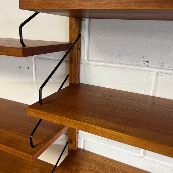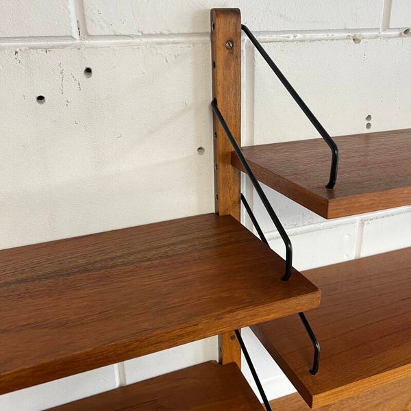 Prachtig vintage wandmeubel, wall unit uitgevoerd in teak (fineer) met zwarte wandlatten en beugels.