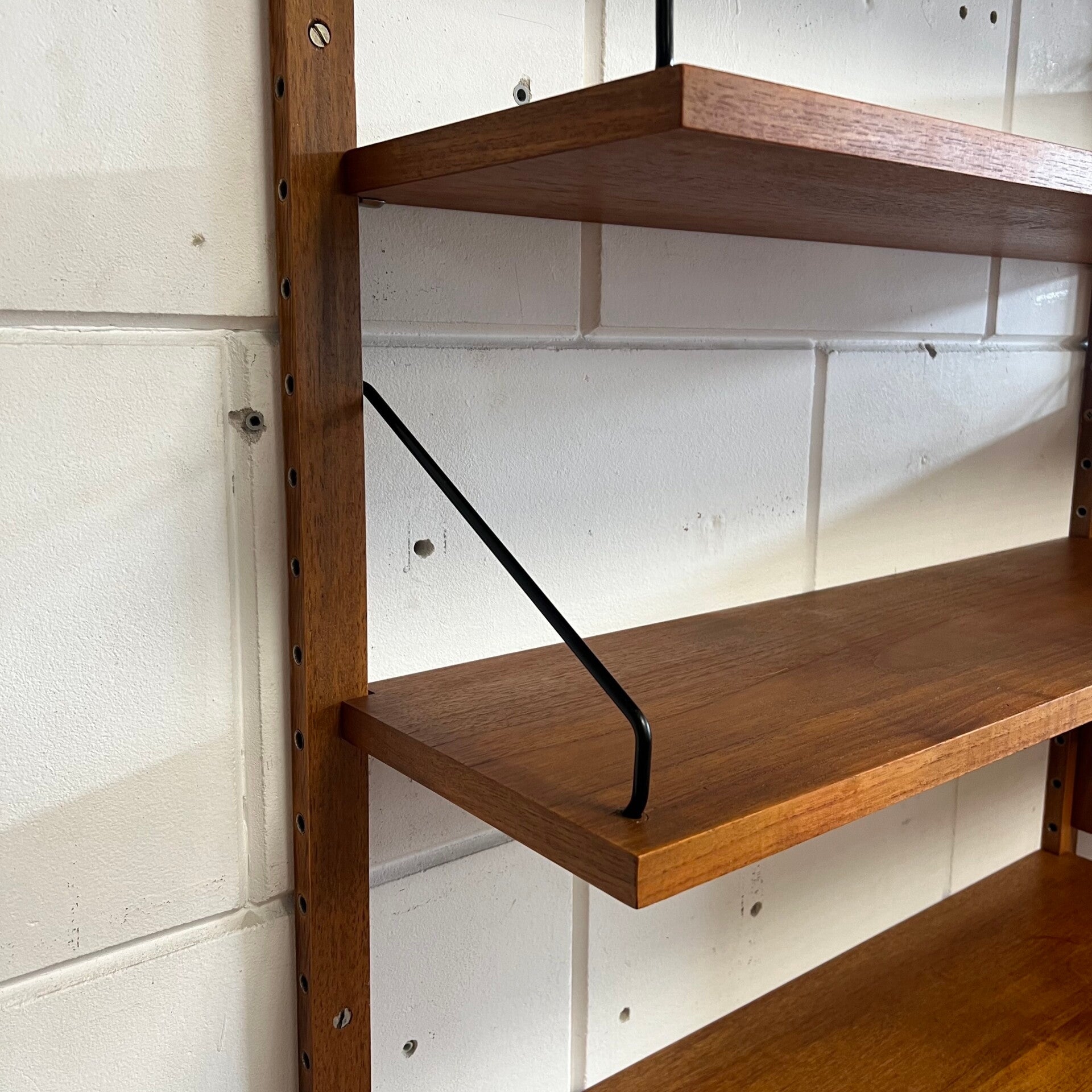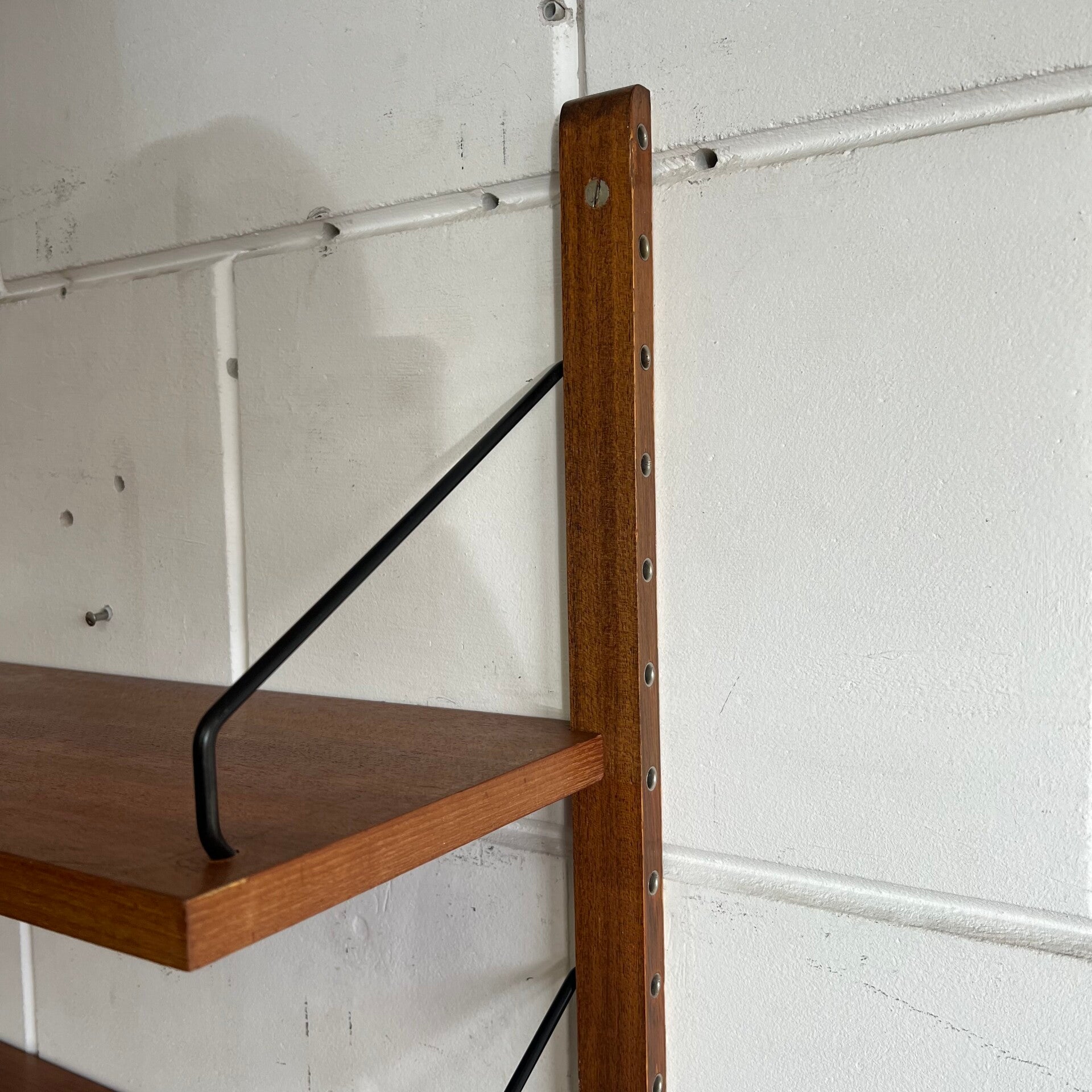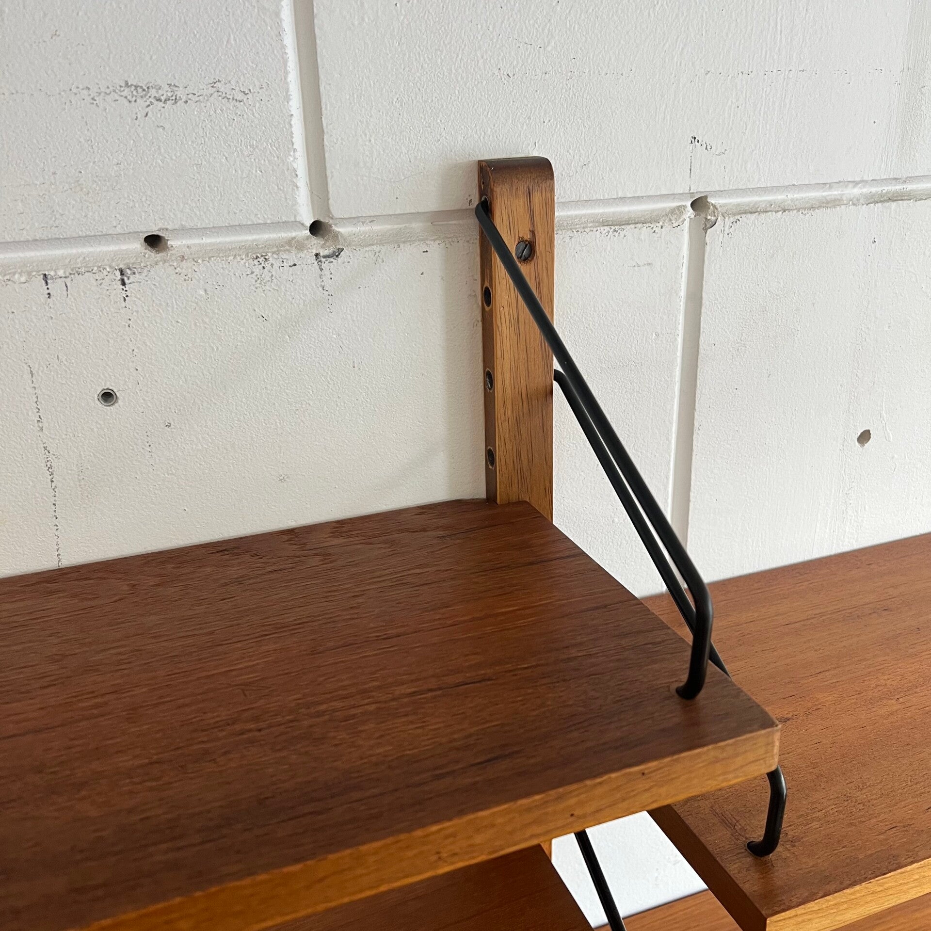 Prachtig vintage wandmeubel, wall unit uitgevoerd in teak (fineer) met zwarte wandlatten en beugels.
