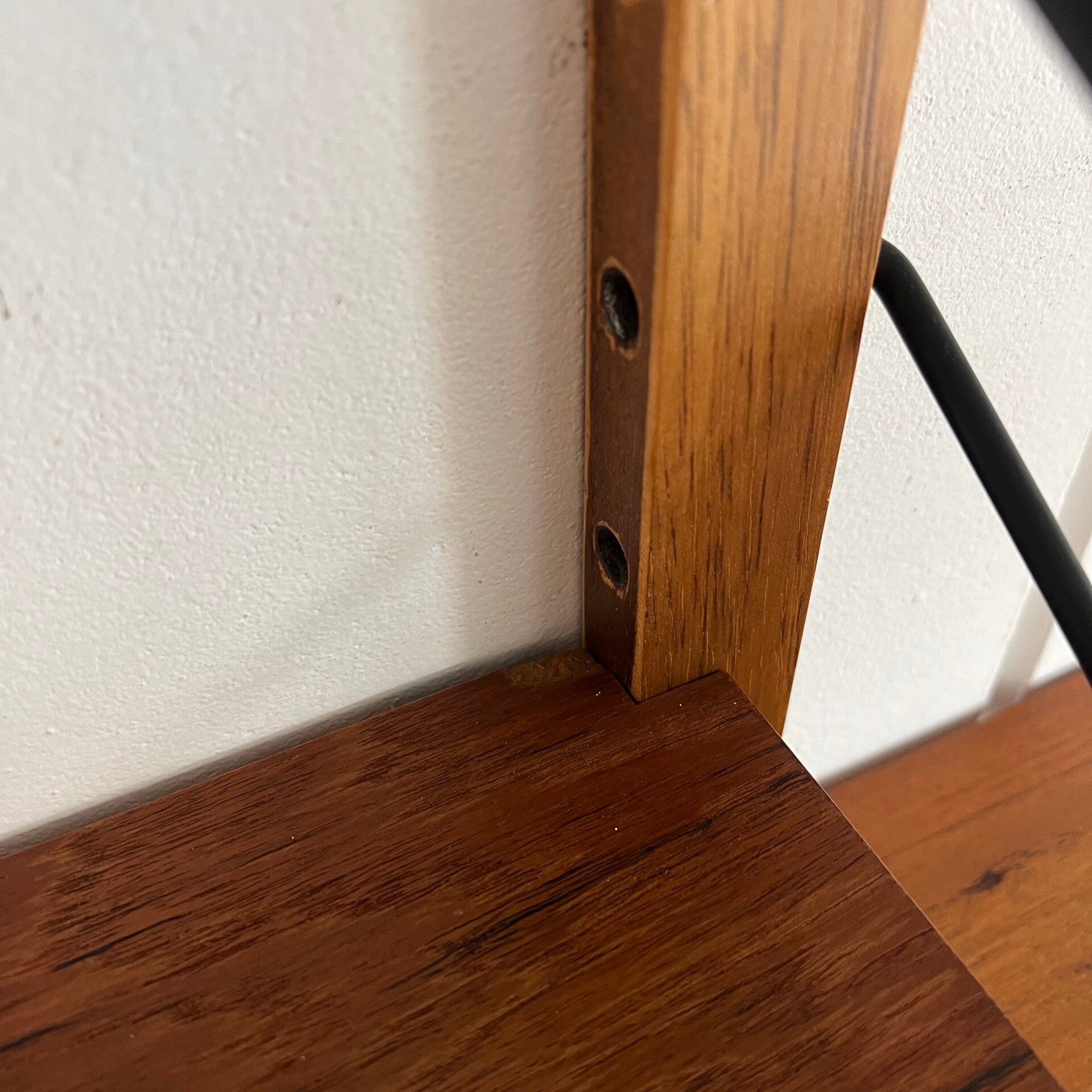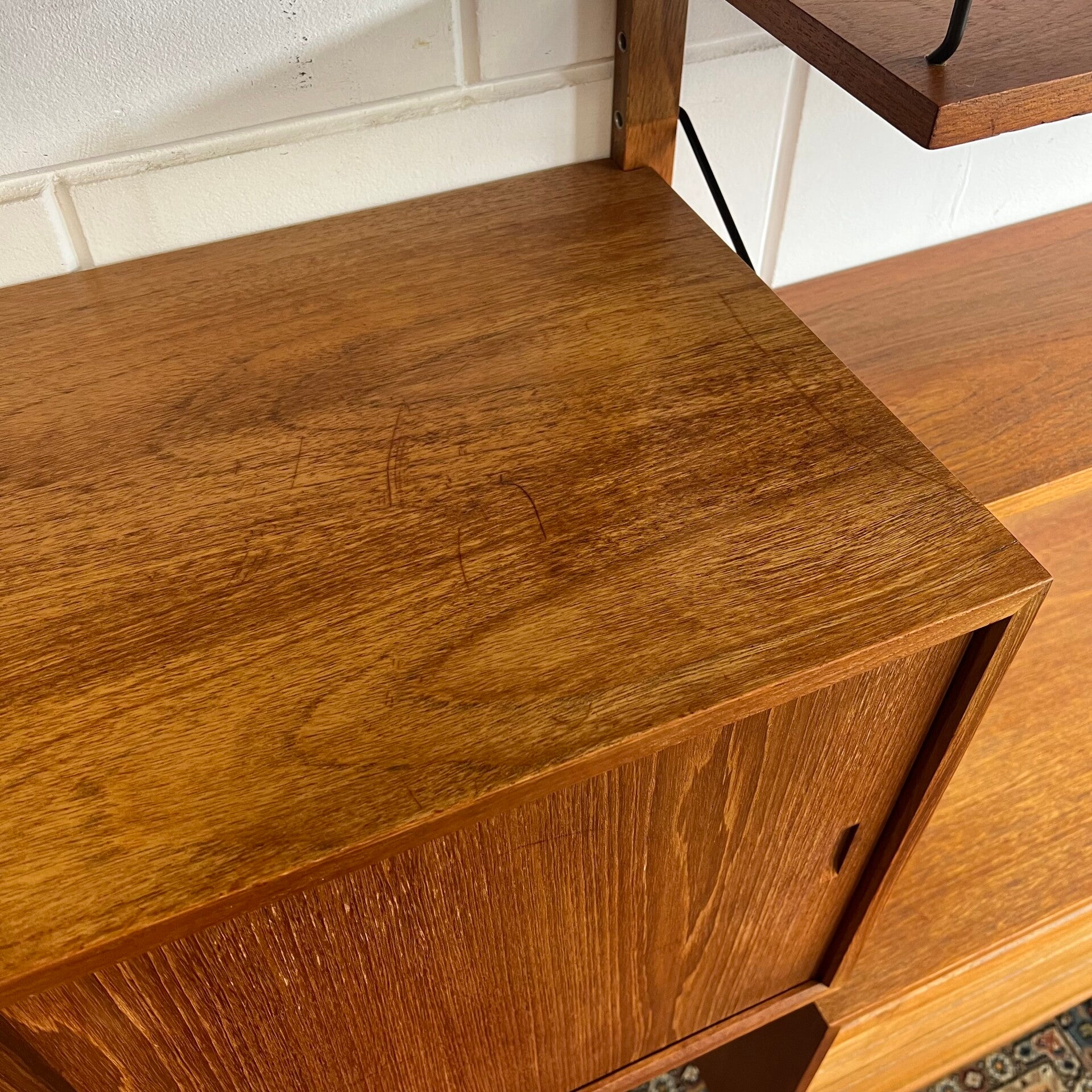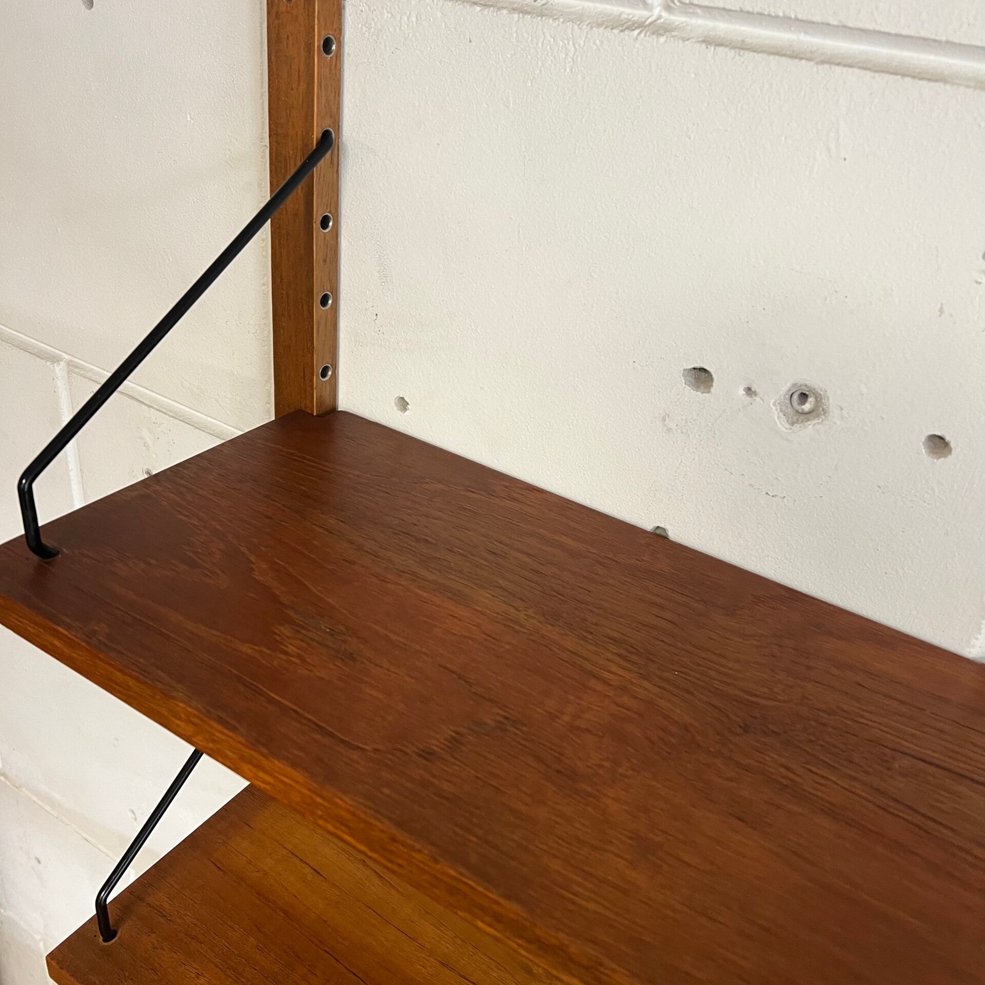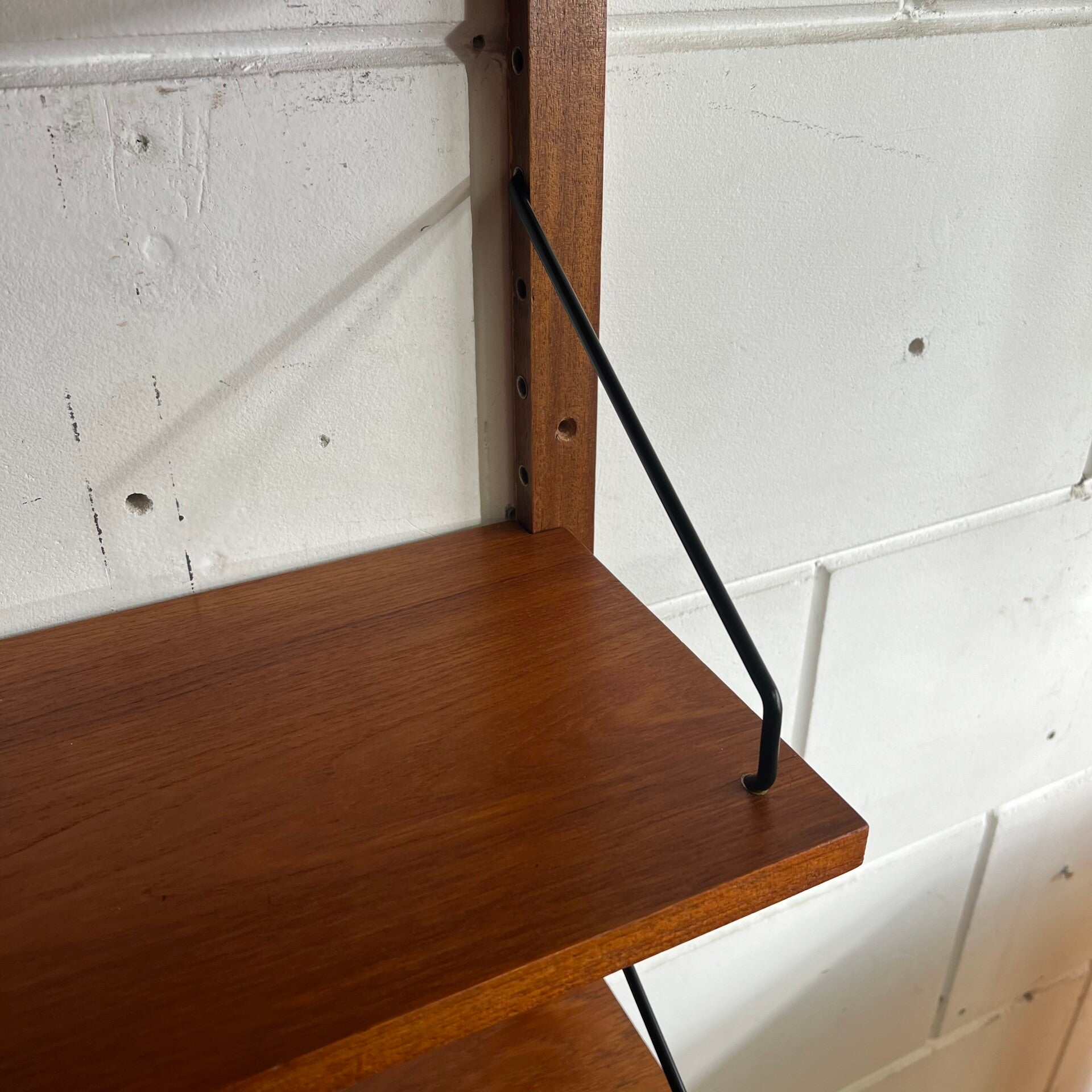 Prachtig vintage wandmeubel, wall unit uitgevoerd in teak (fineer) met zwarte wandlatten en beugels.
