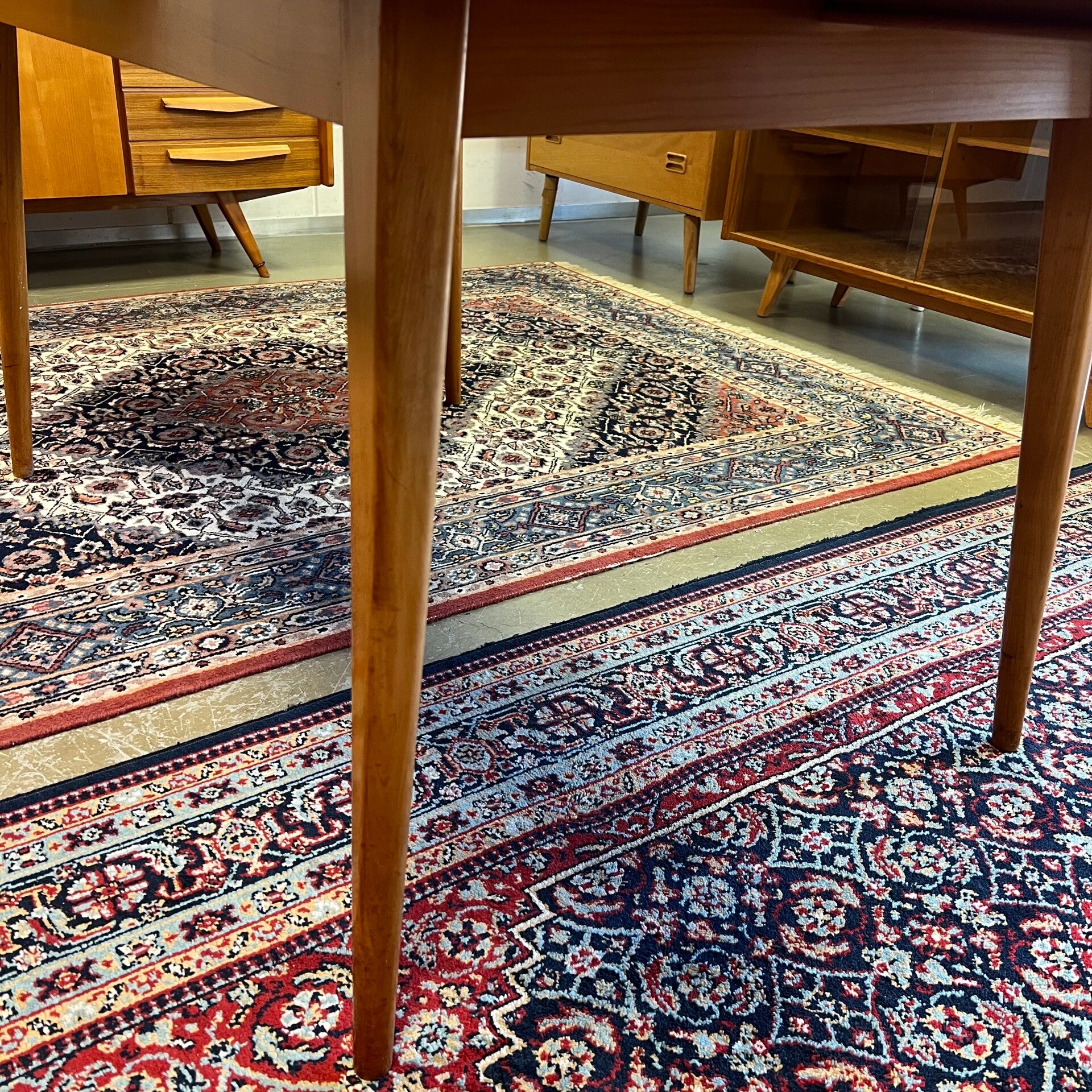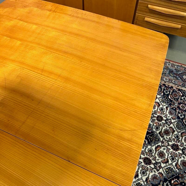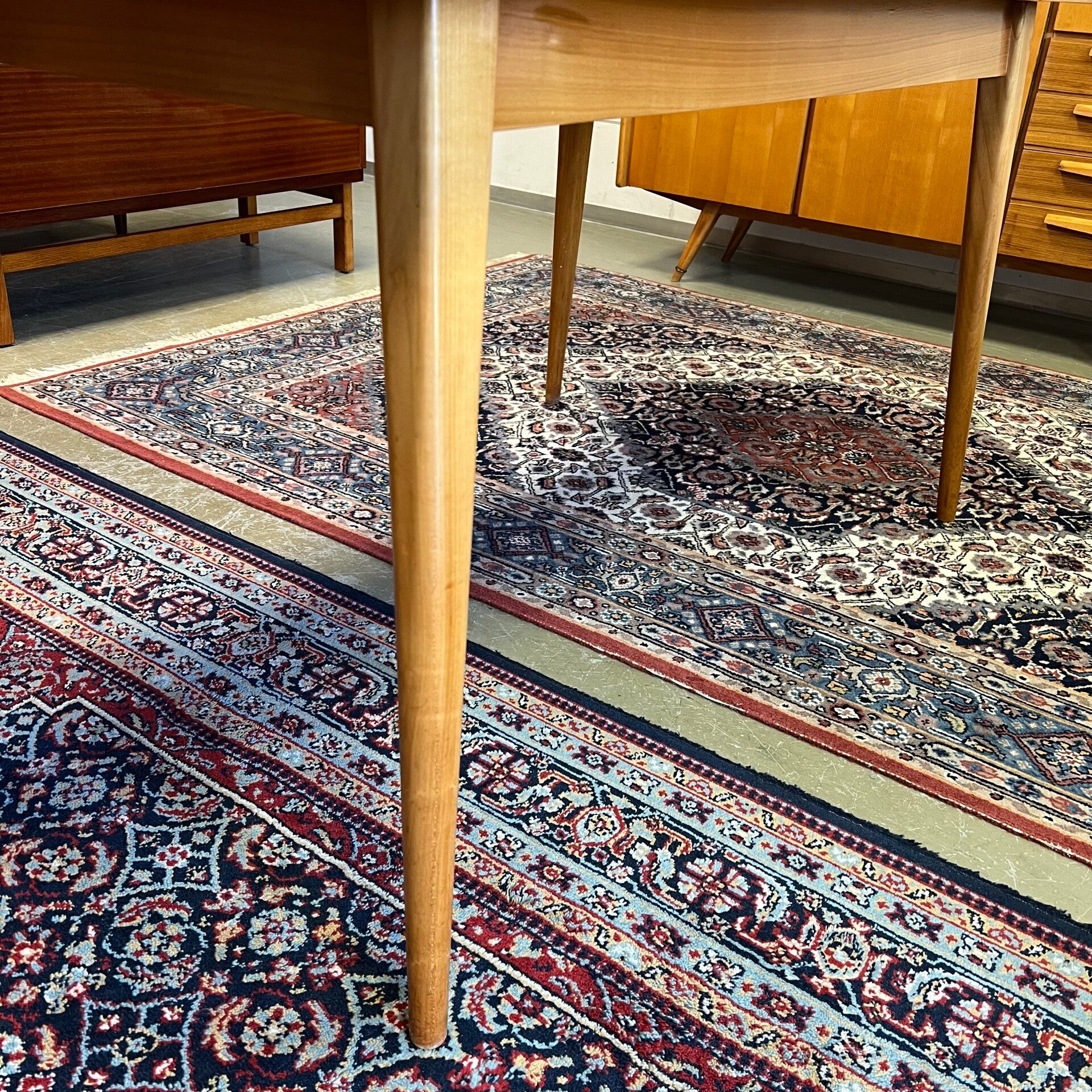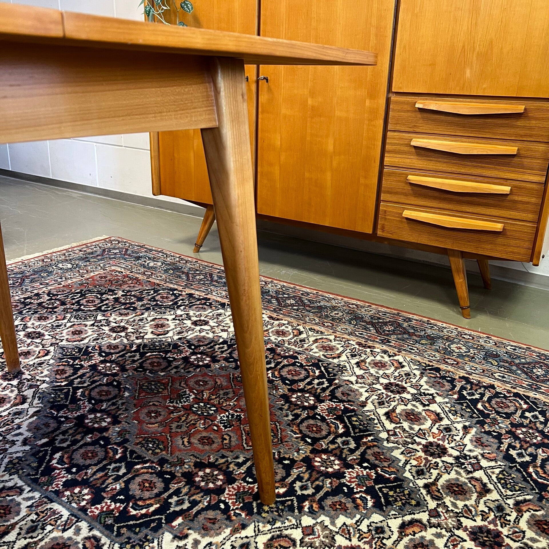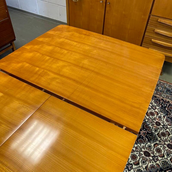 Leuke verlengbare vintage eettafel met slanke schuine poten (niet demontabel).