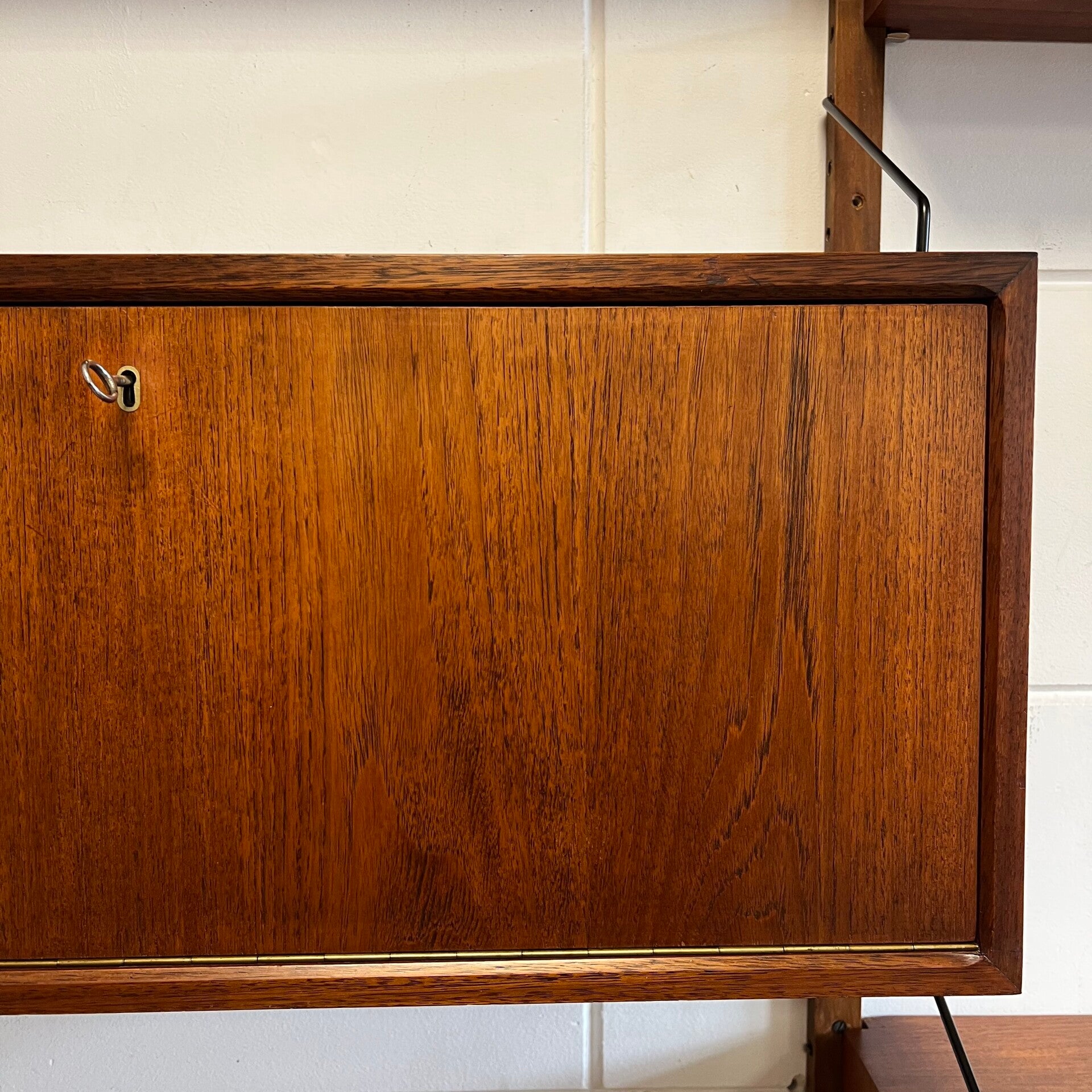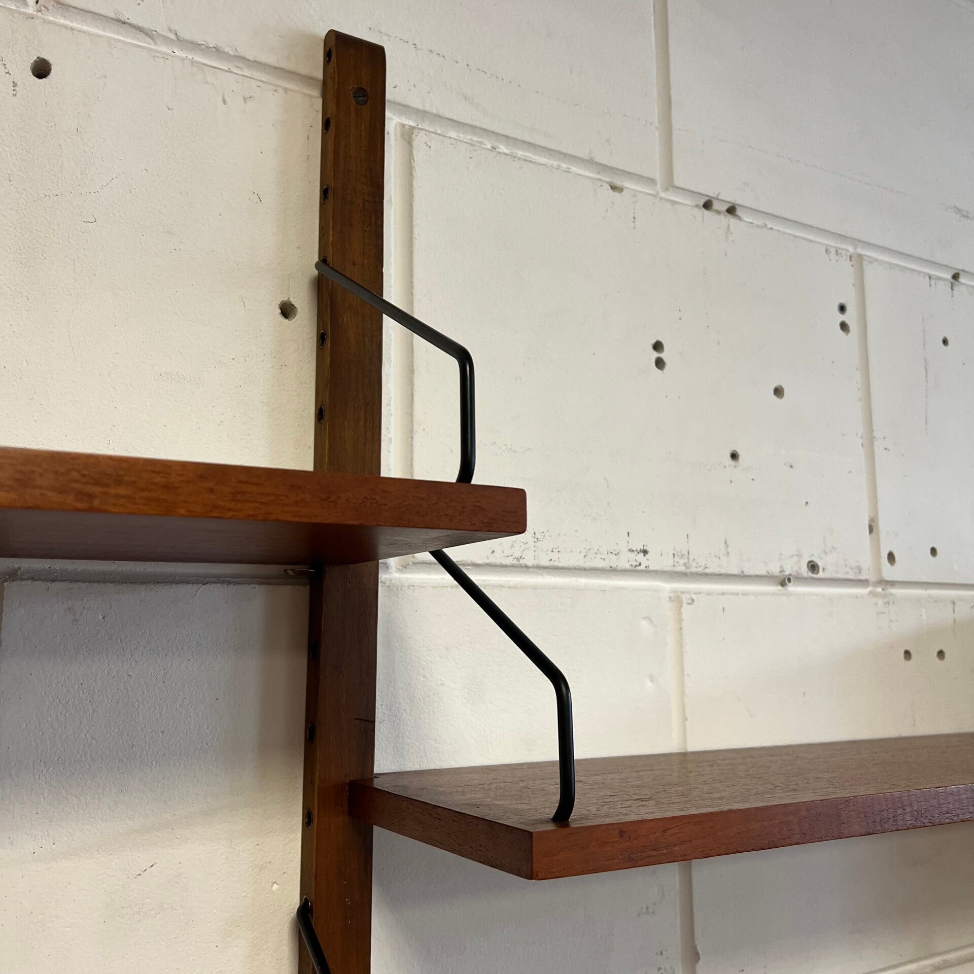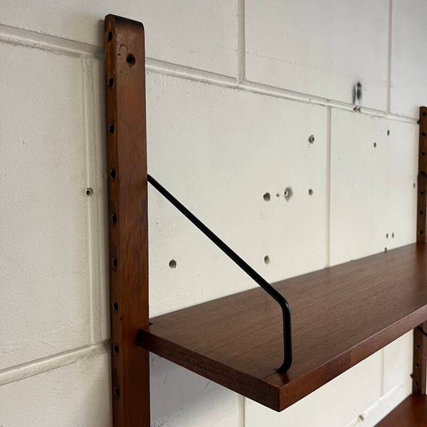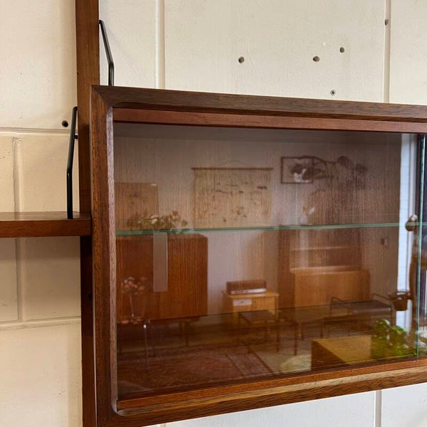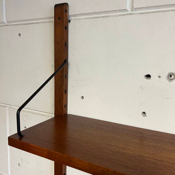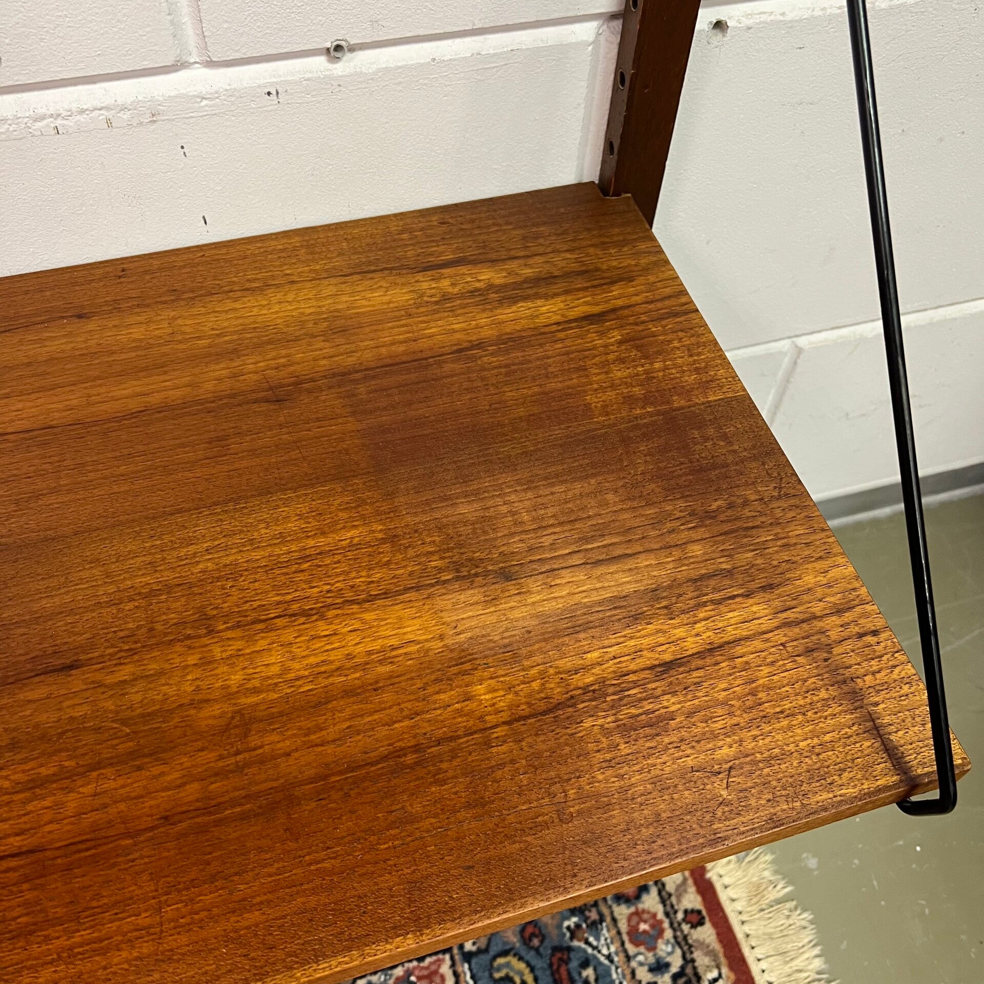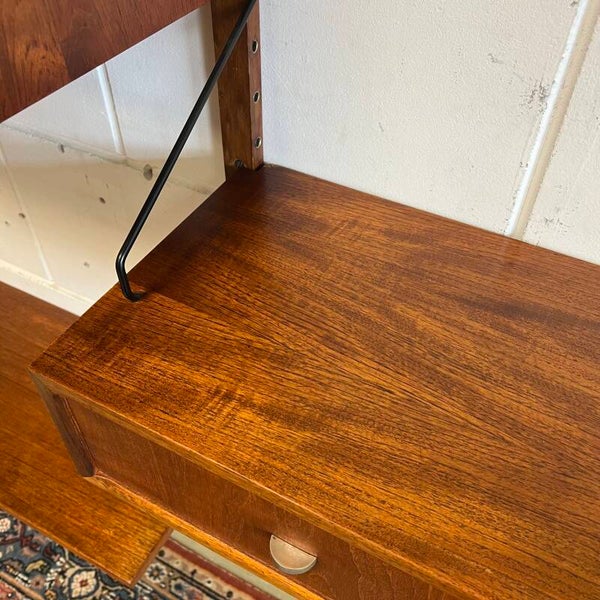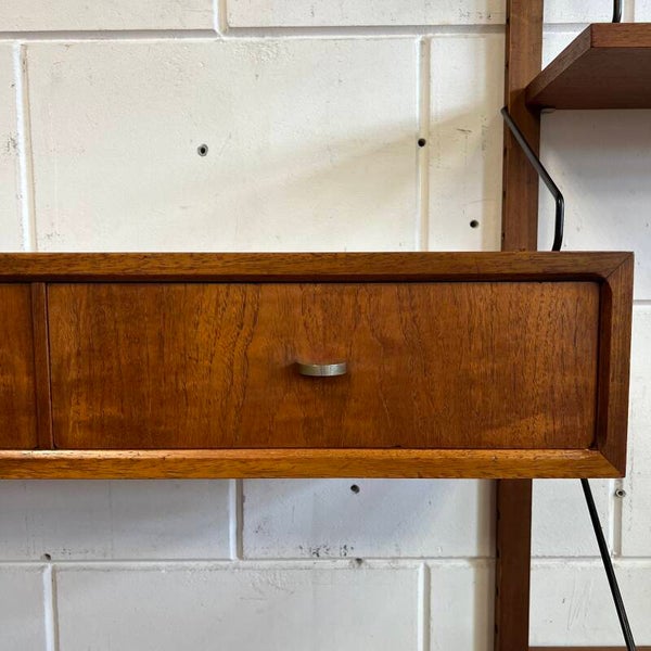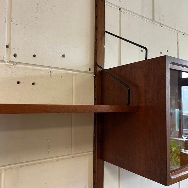 Prachtig vintage wandmeubel, wall unit uitgevoerd in teak (fineer) met zwarte wandlatten en beugels.