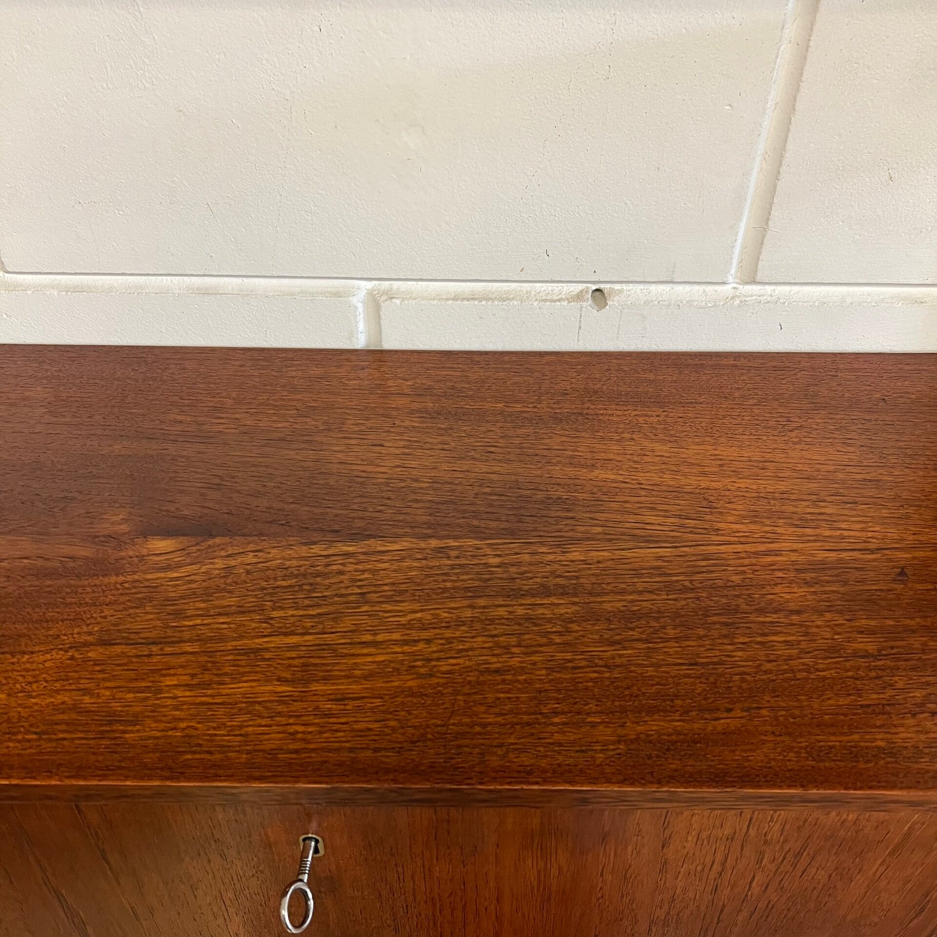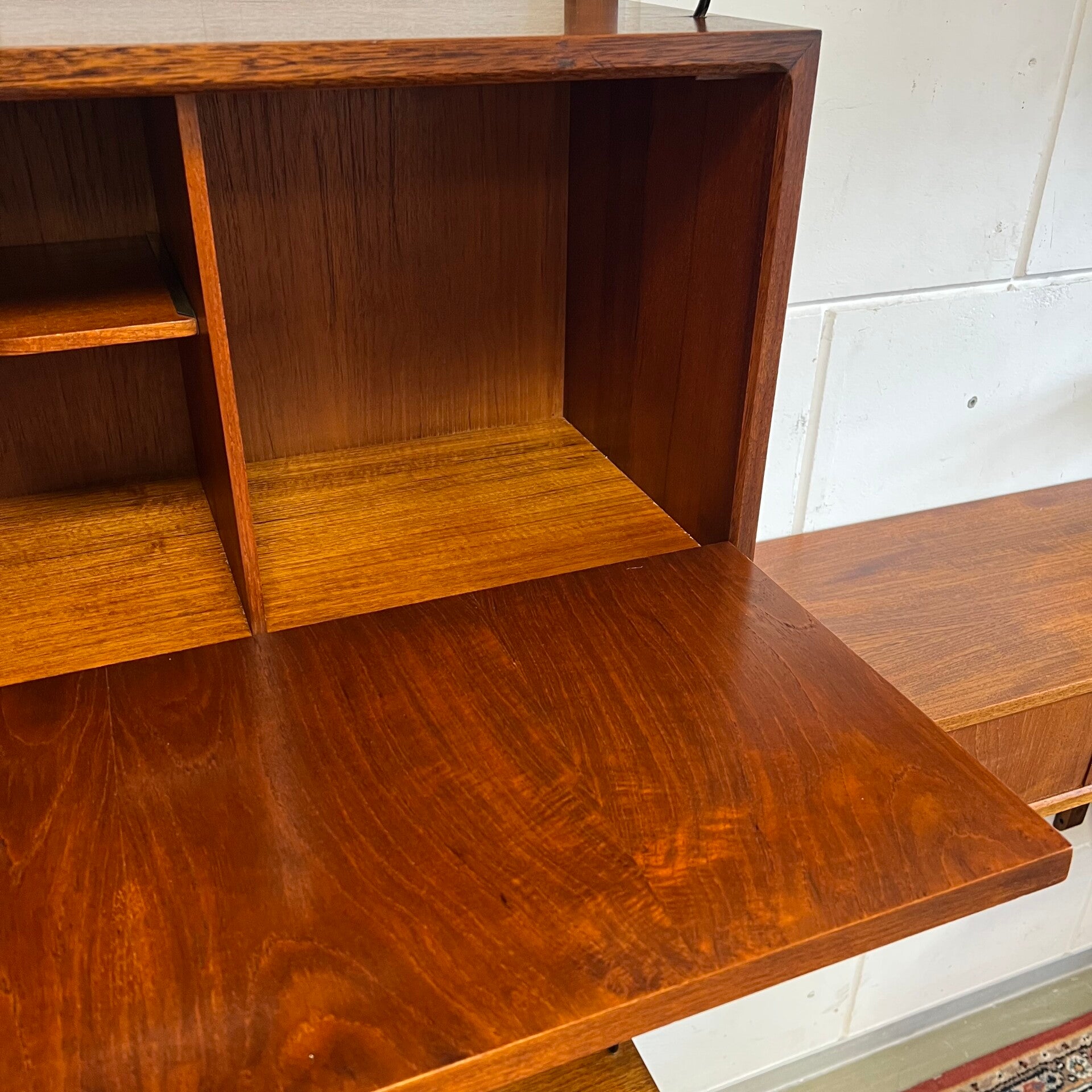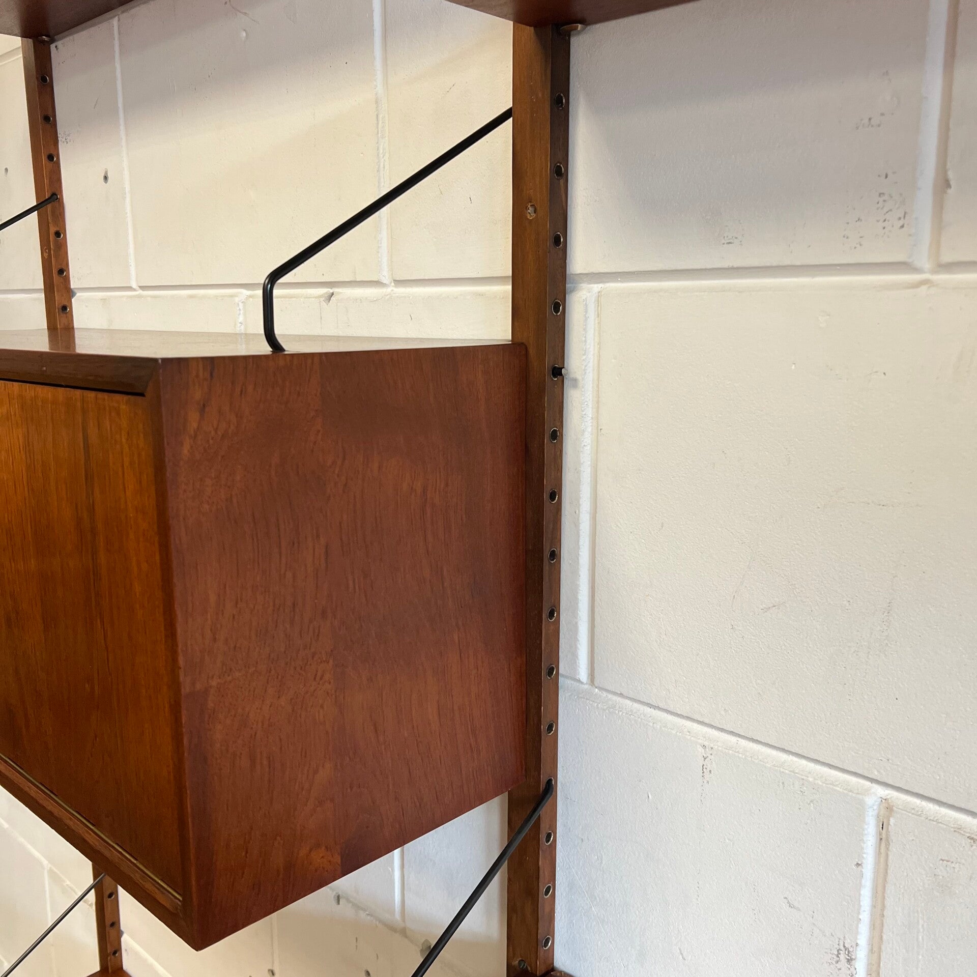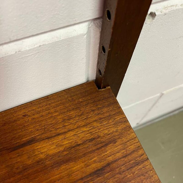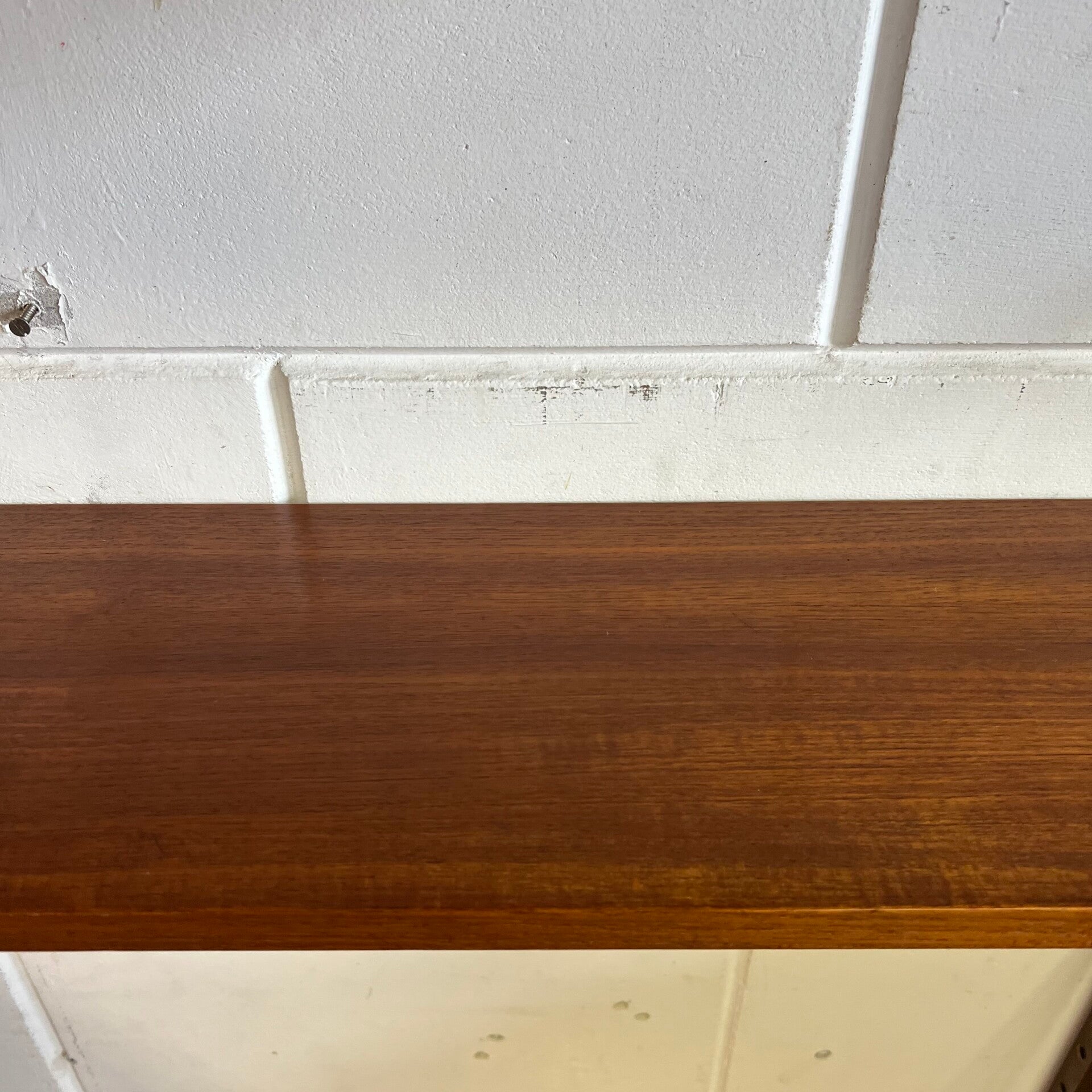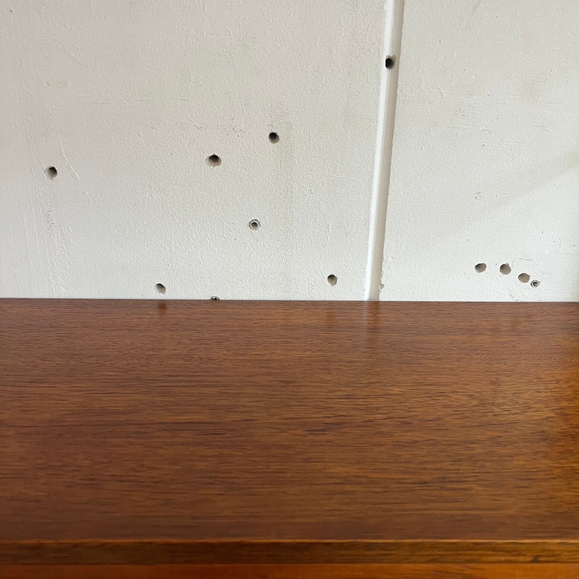 Prachtig vintage wandmeubel, wall unit uitgevoerd in teak (fineer) met zwarte wandlatten en beugels.