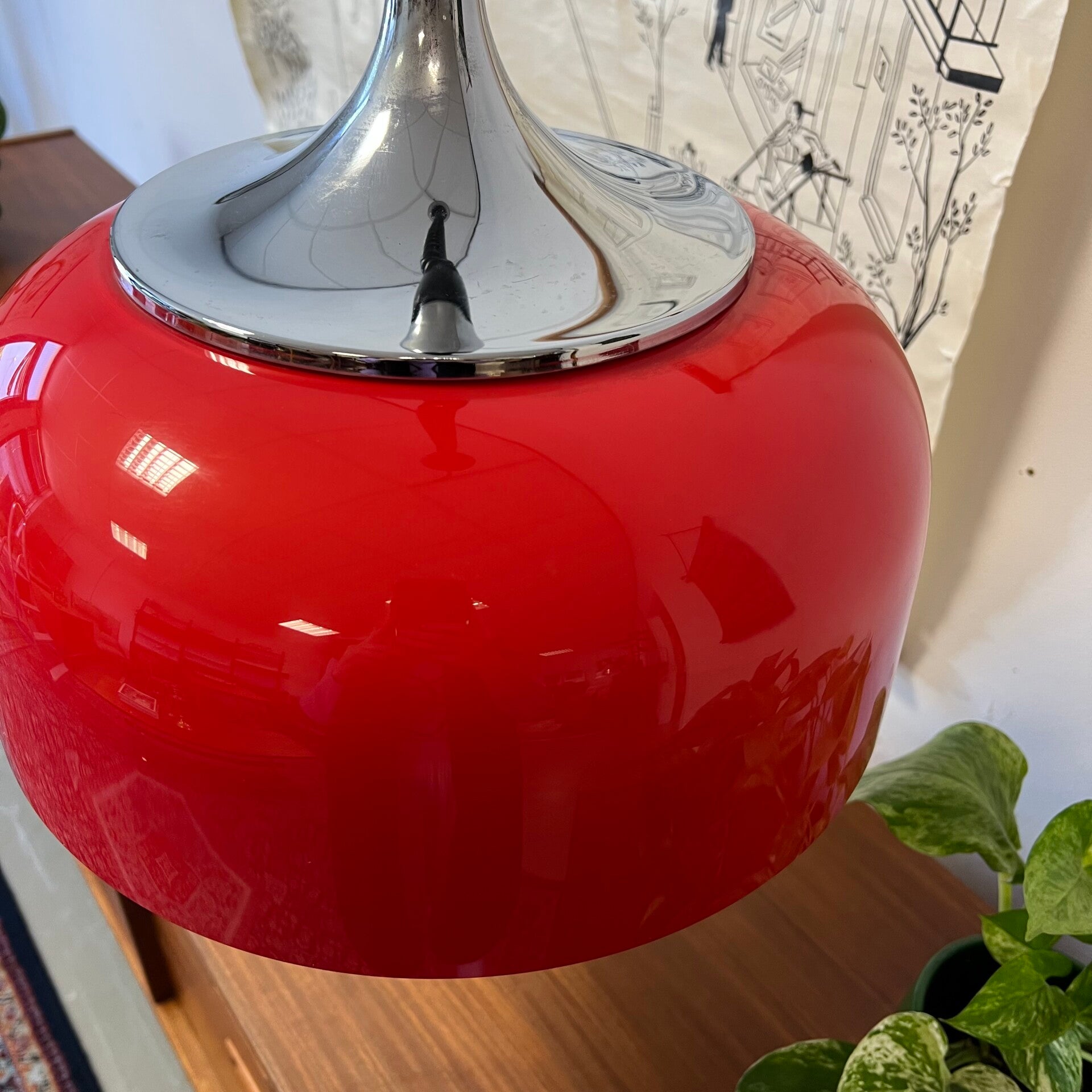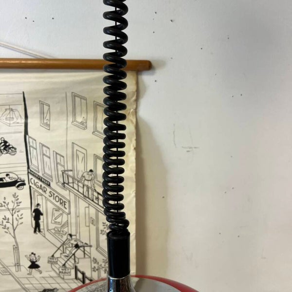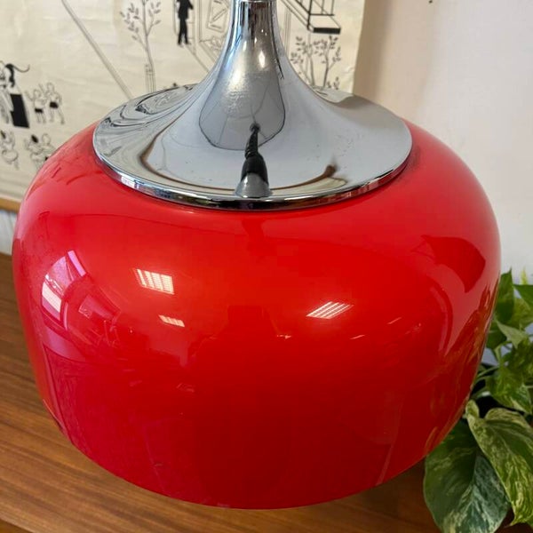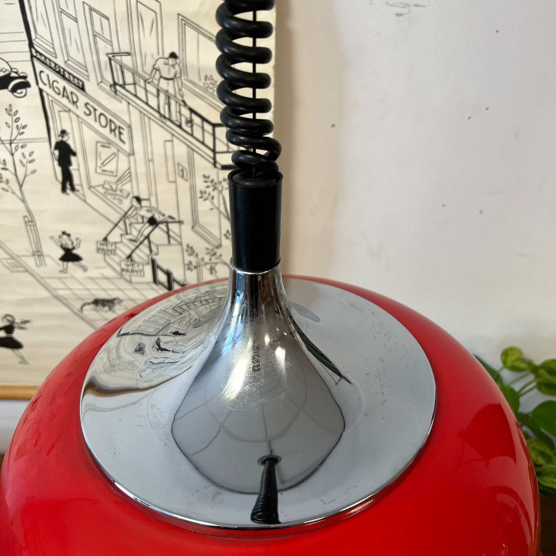 Mooie vintage rood/oranje hanglamp met plastic kap, chromen frame en zwart trekkoord.