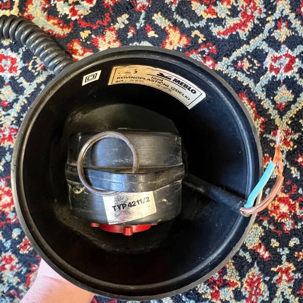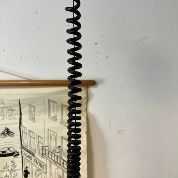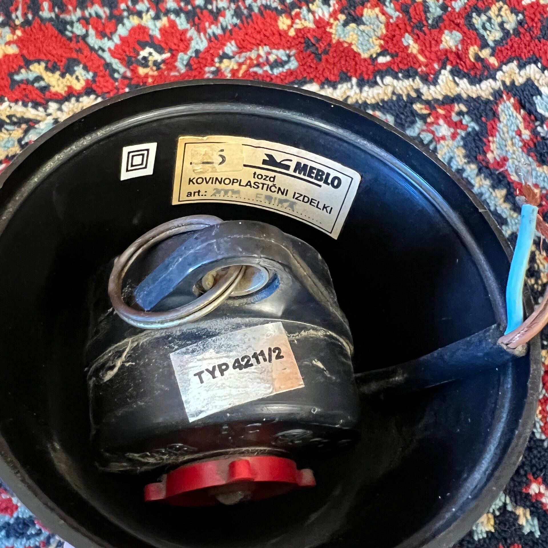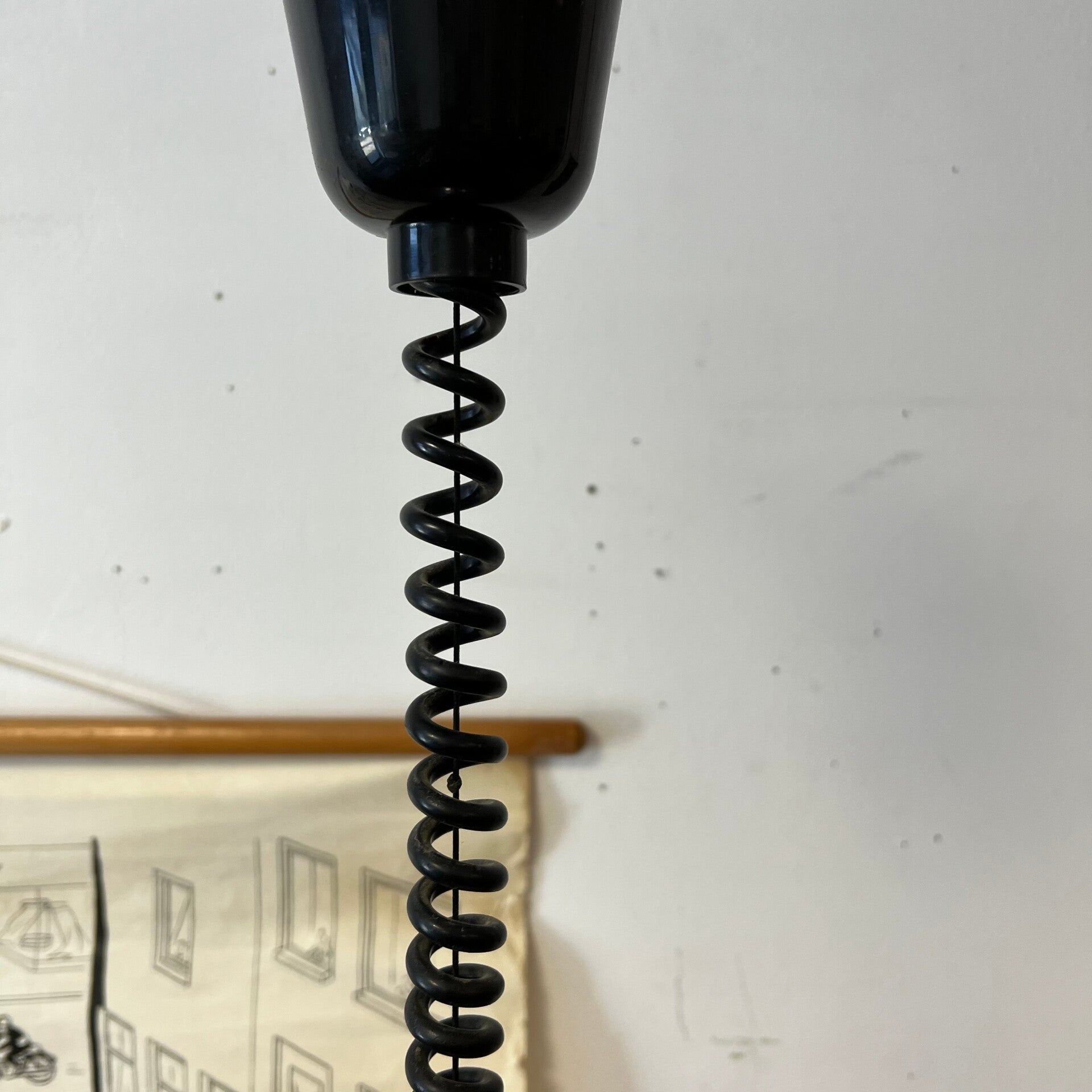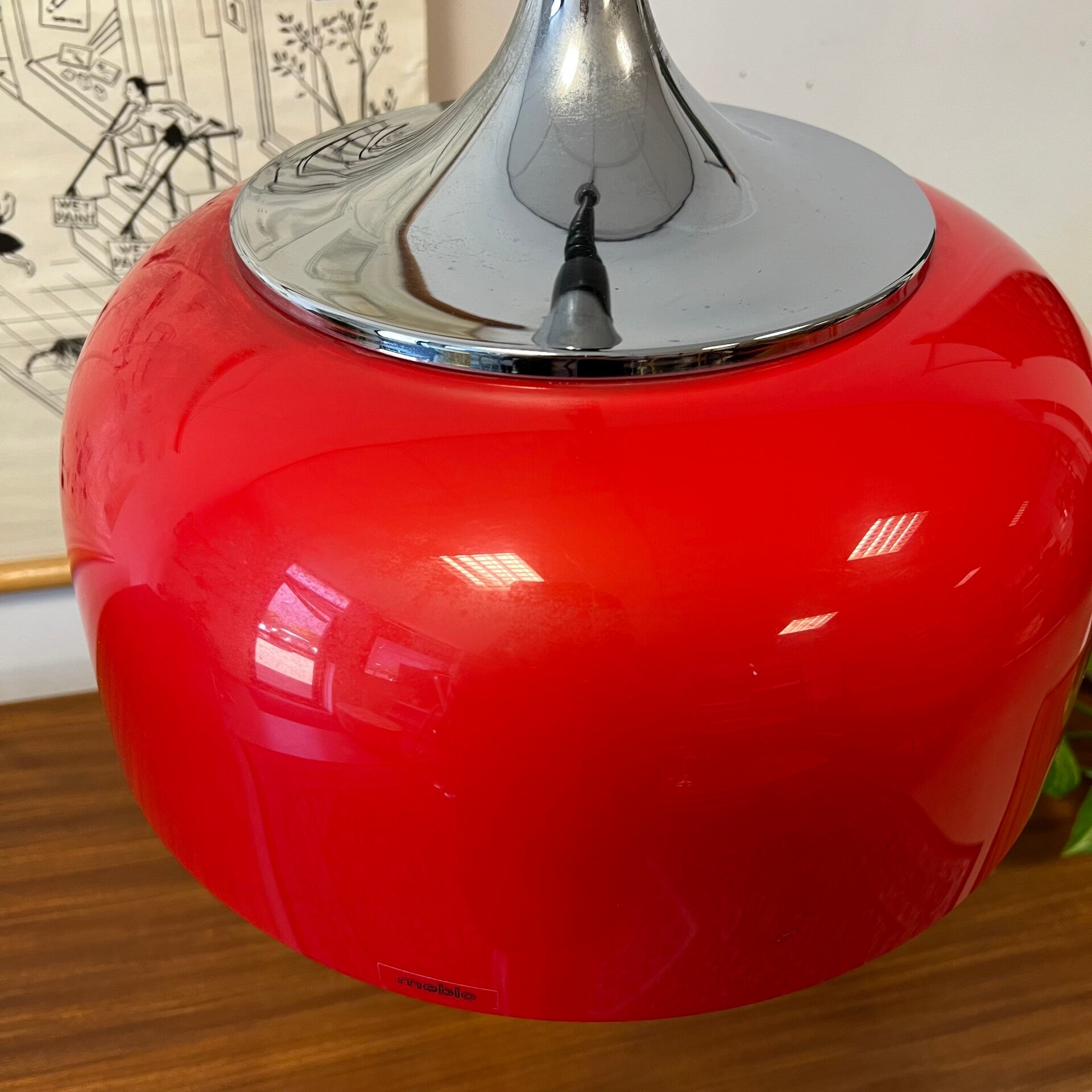 Mooie vintage rood/oranje hanglamp met plastic kap, chromen frame en zwart trekkoord.