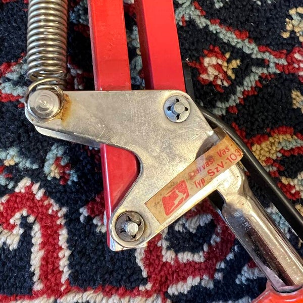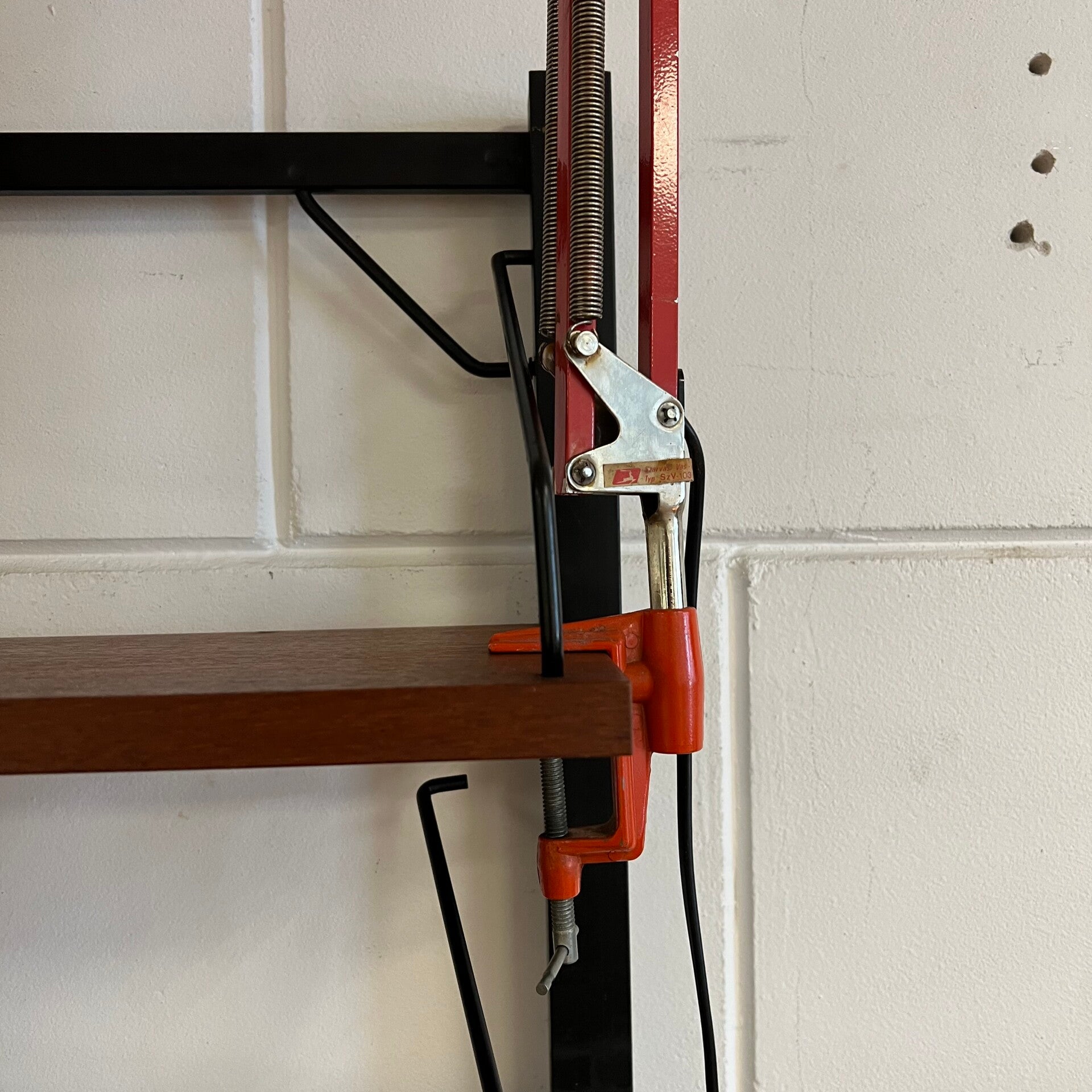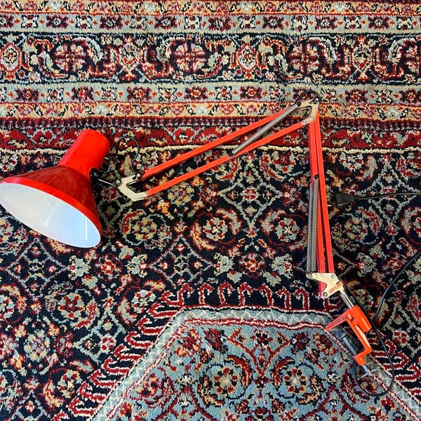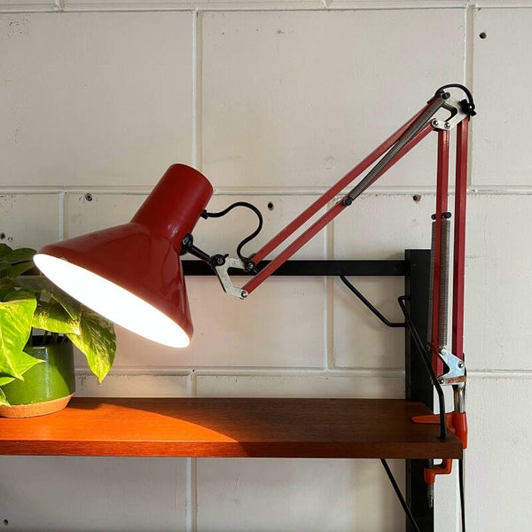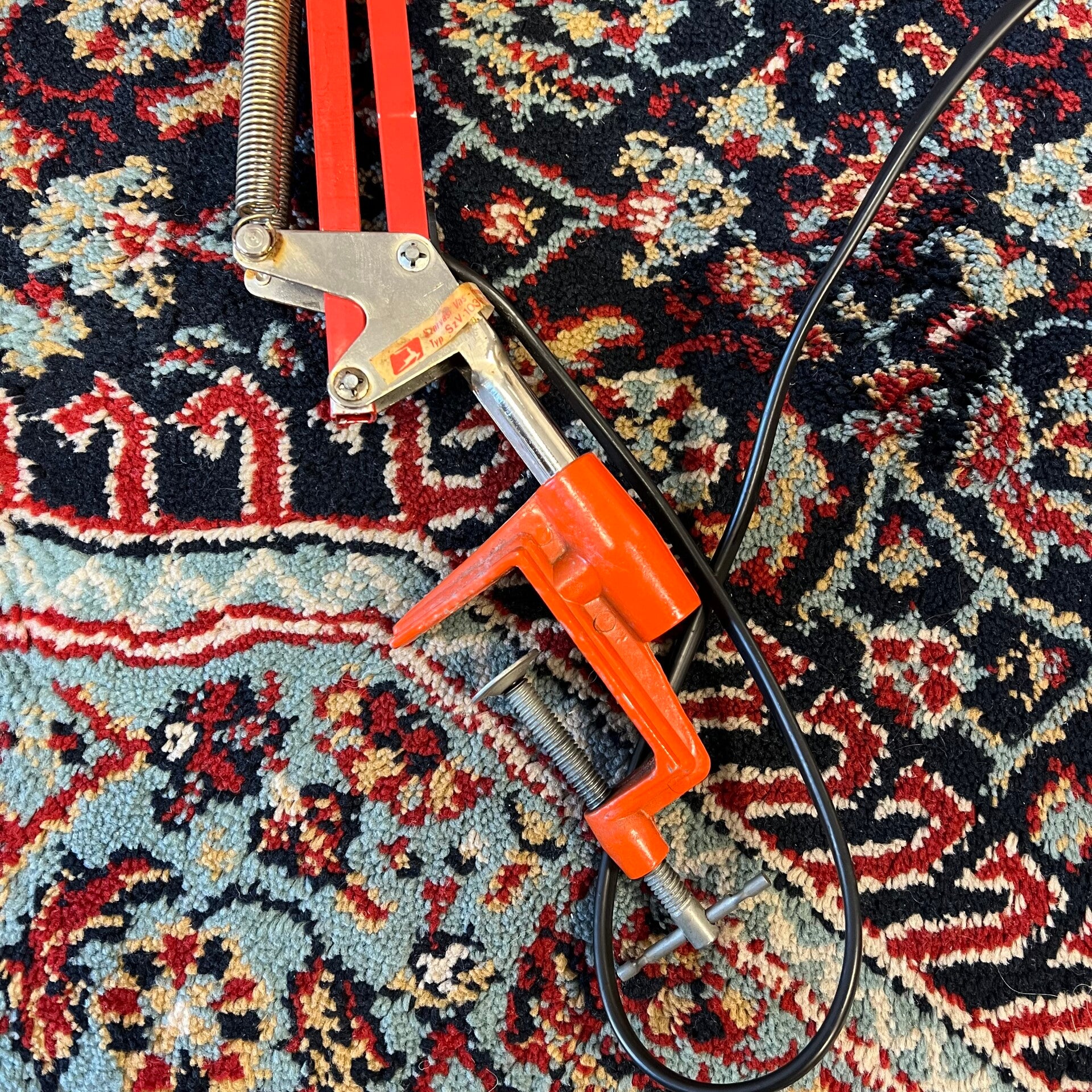Vintage oranje metalen architectenlamp, bureaulamp, scharnierlamp.