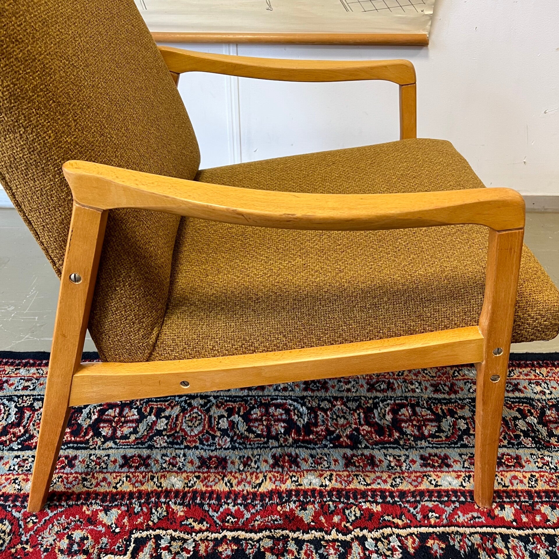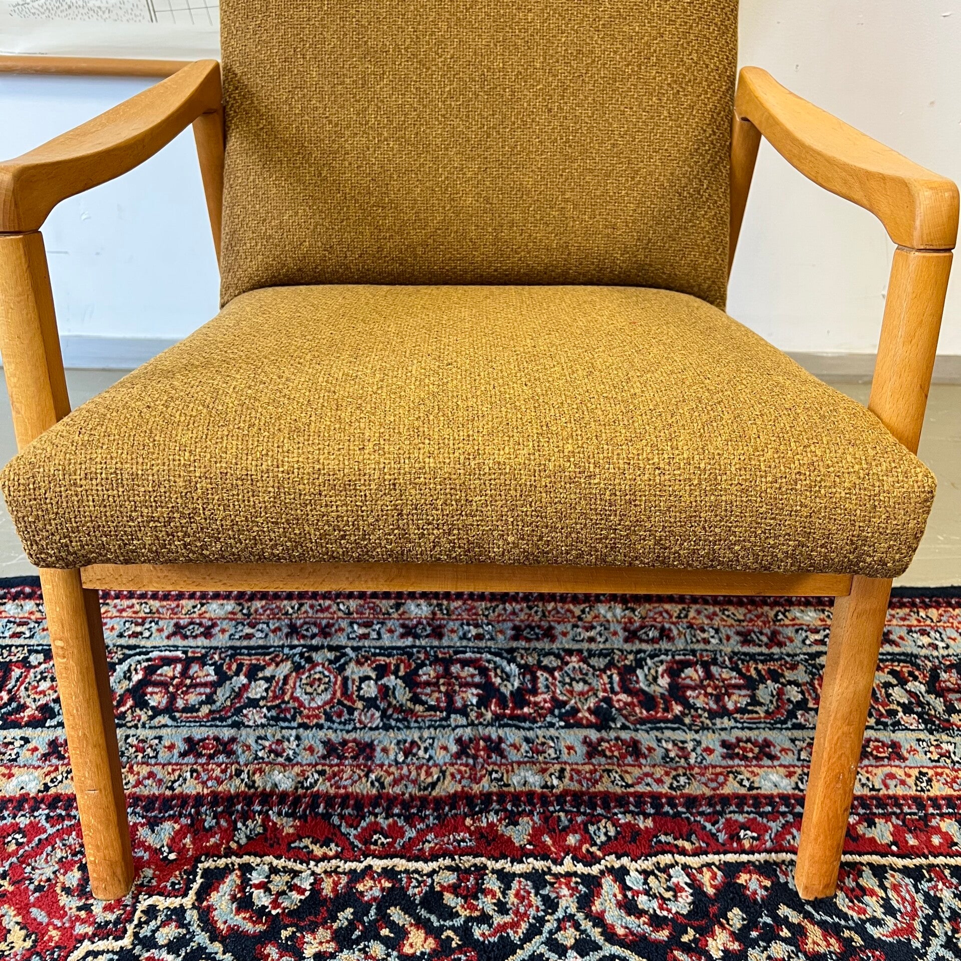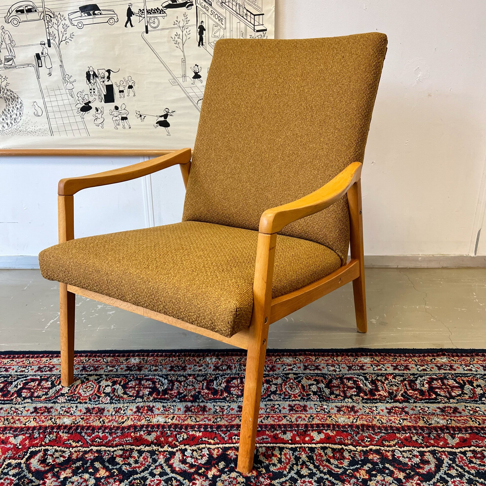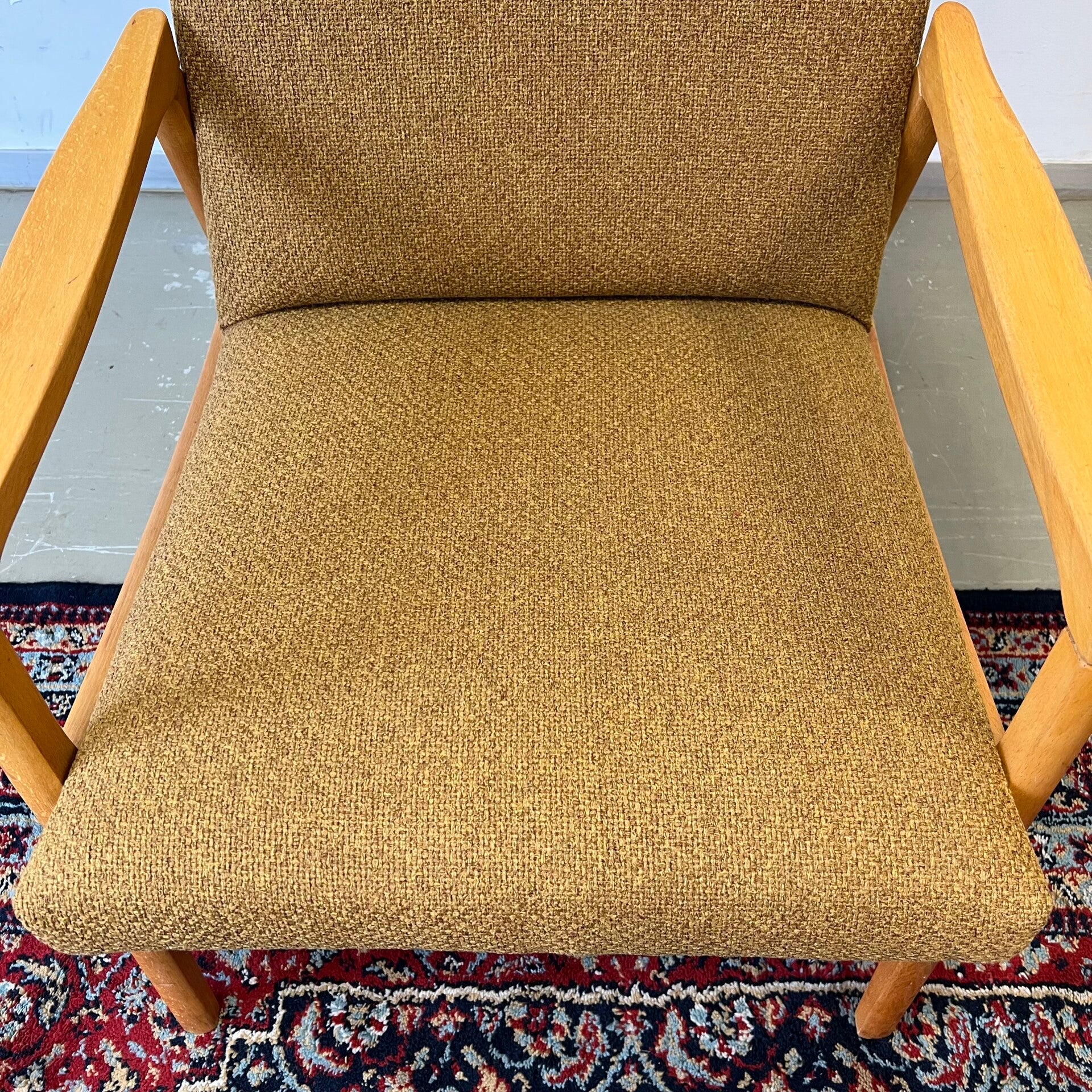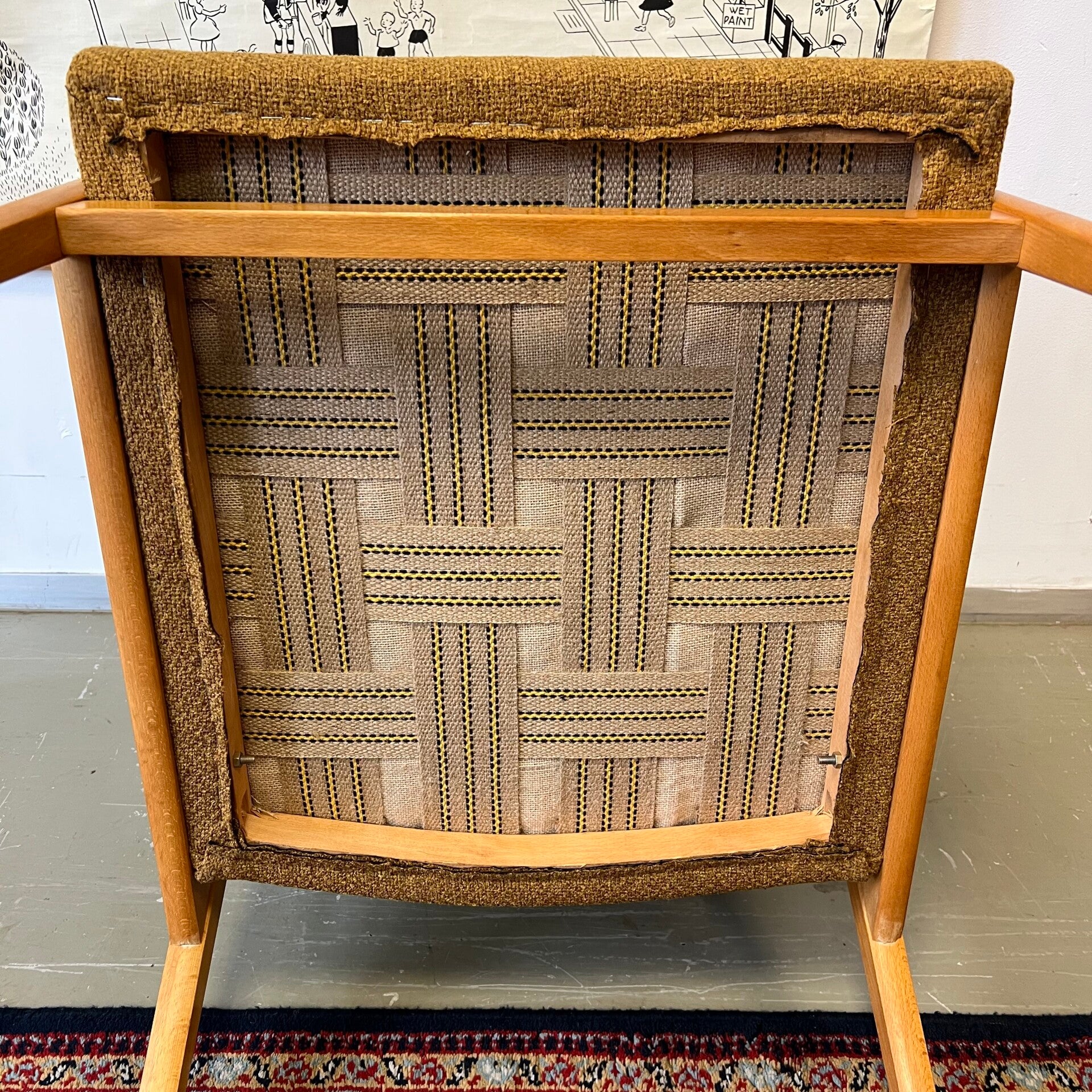 Leuke vintage gerestaureerde fauteuil met licht houten frame en nieuwe bruin/beige bekleding.
