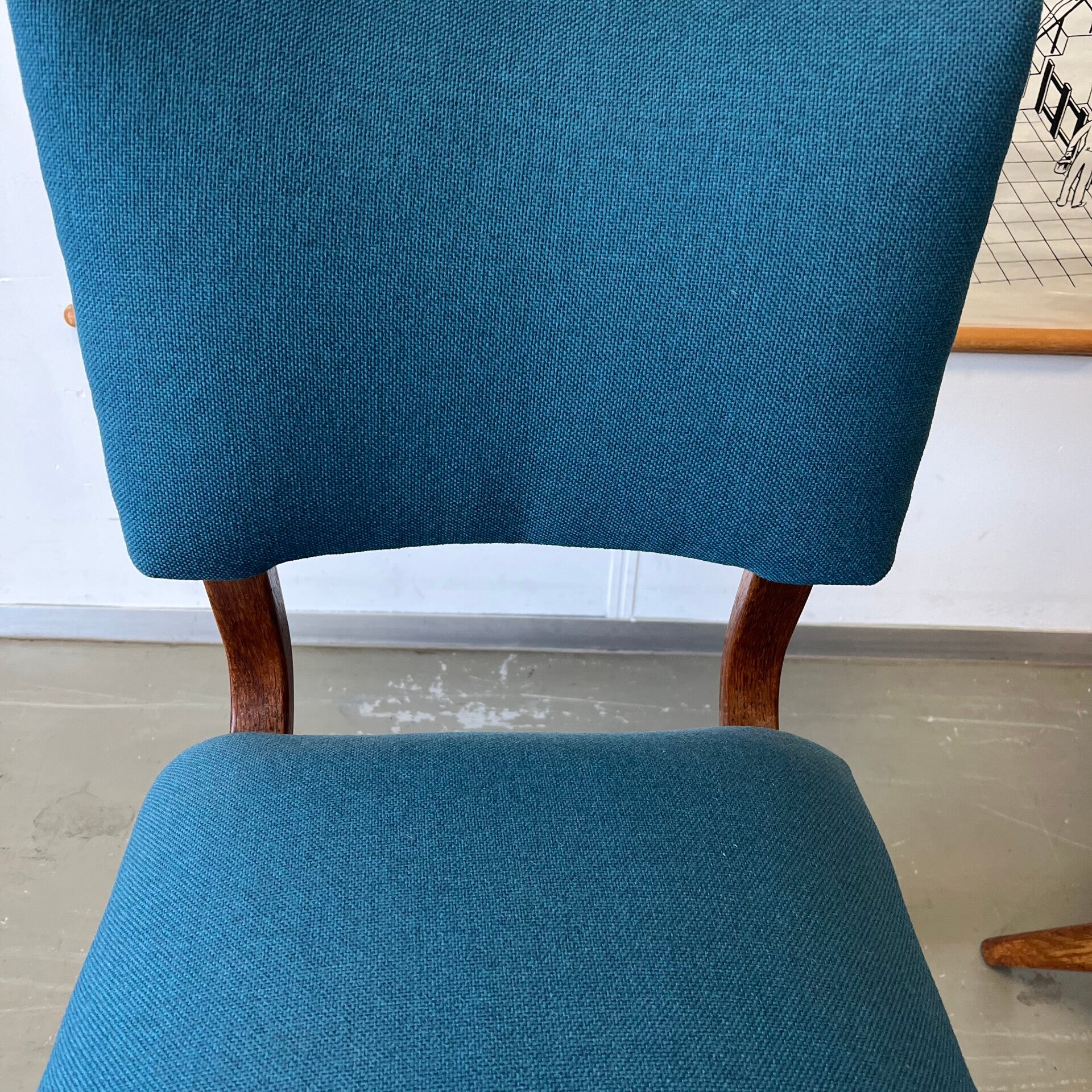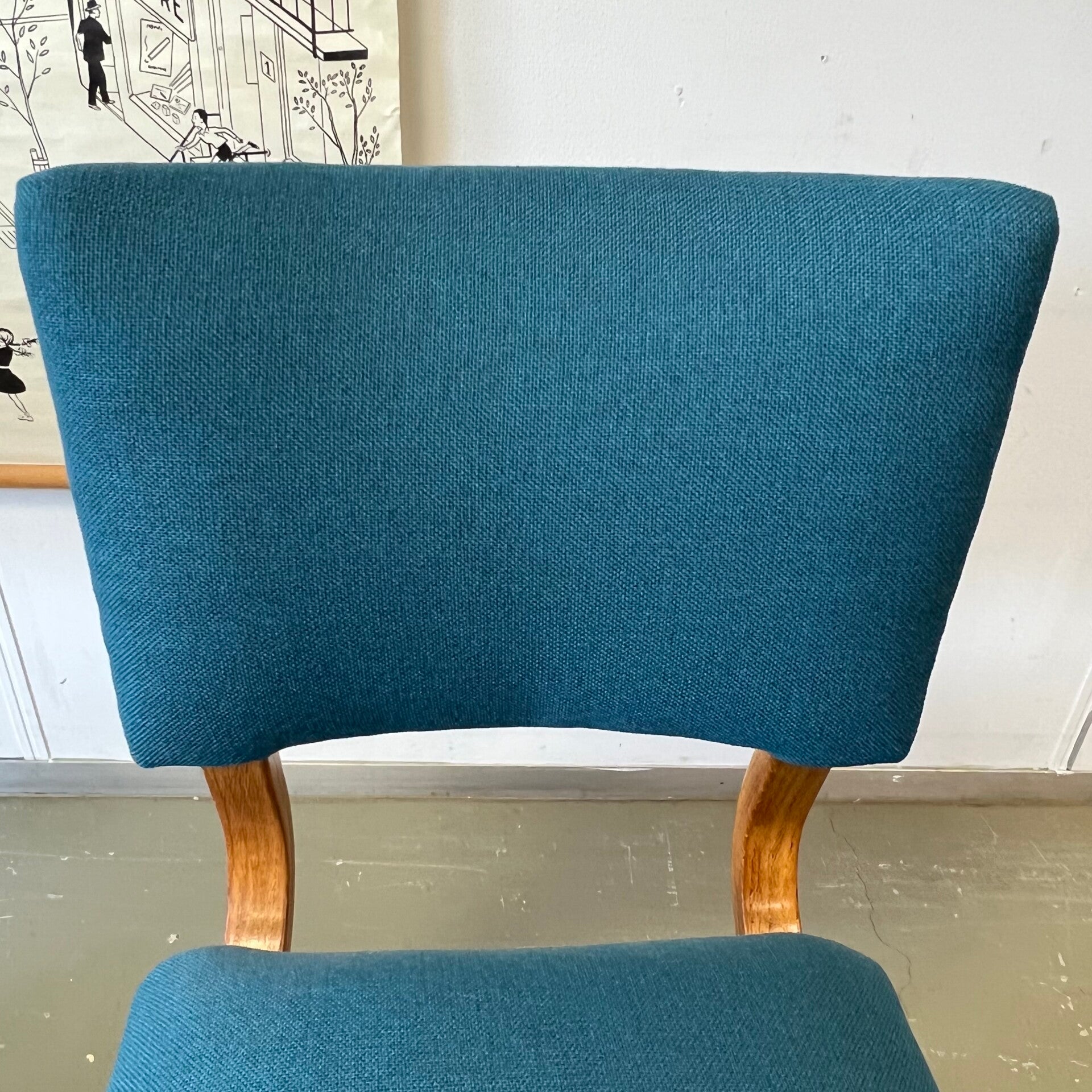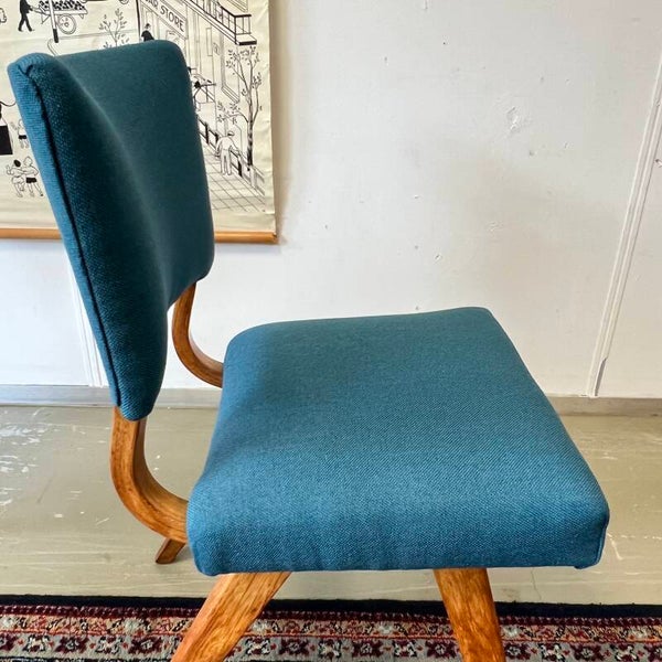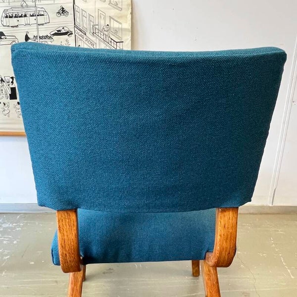 Mooi houten frame met opnieuw gestoffeerde zitting en rugleuning (petrol/blauw).