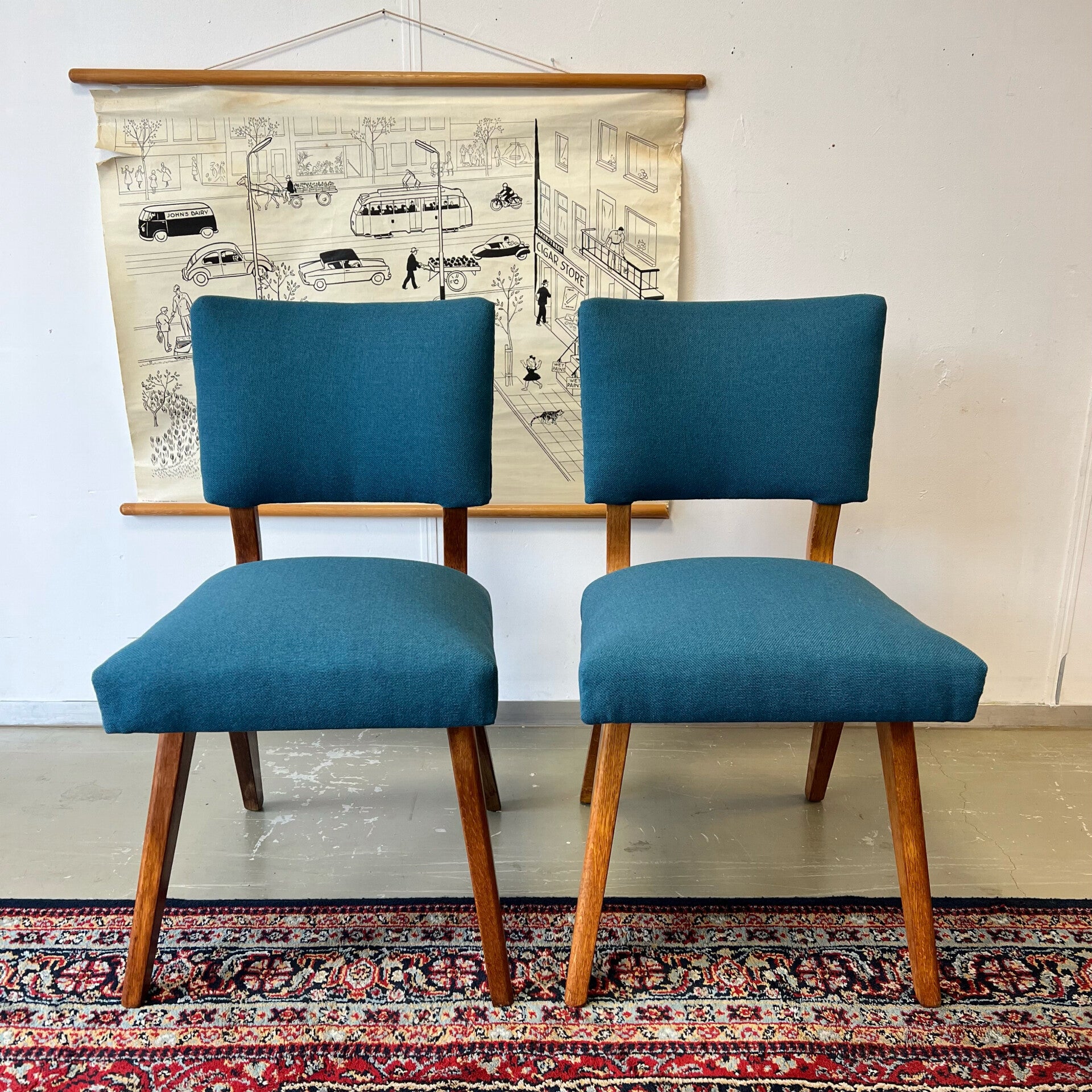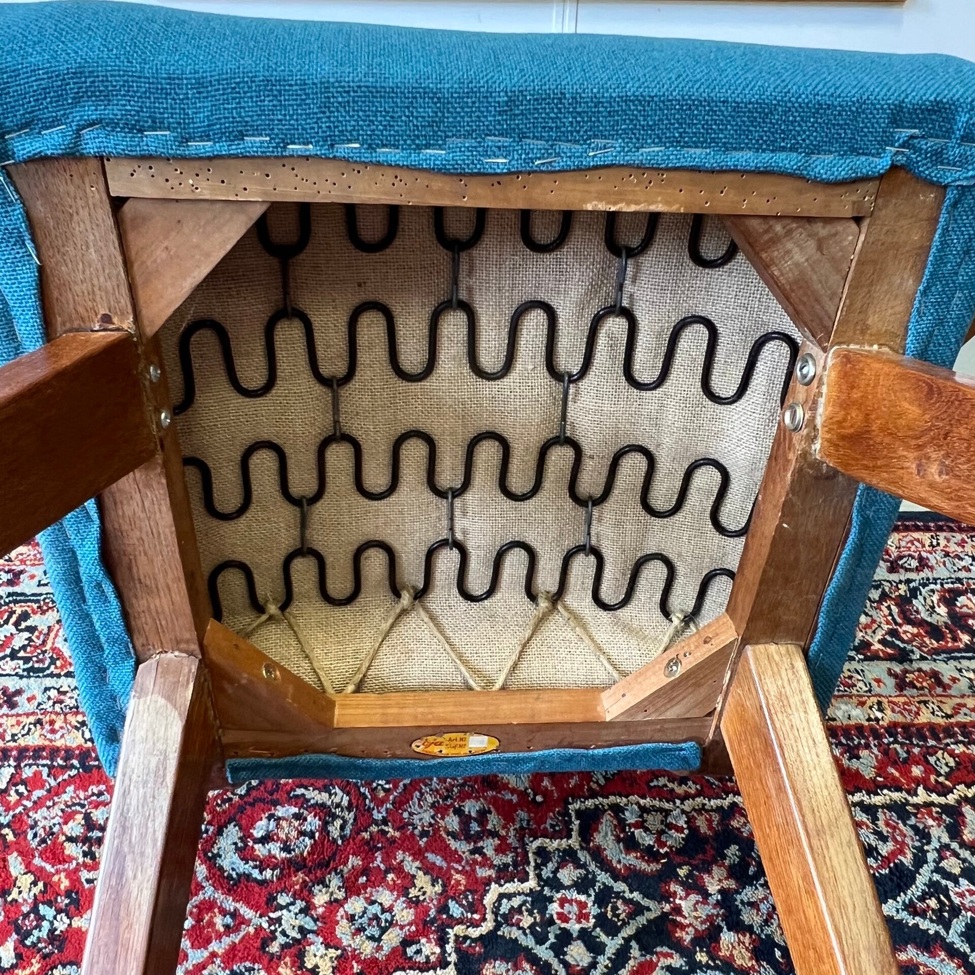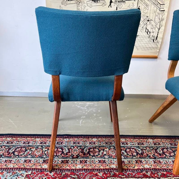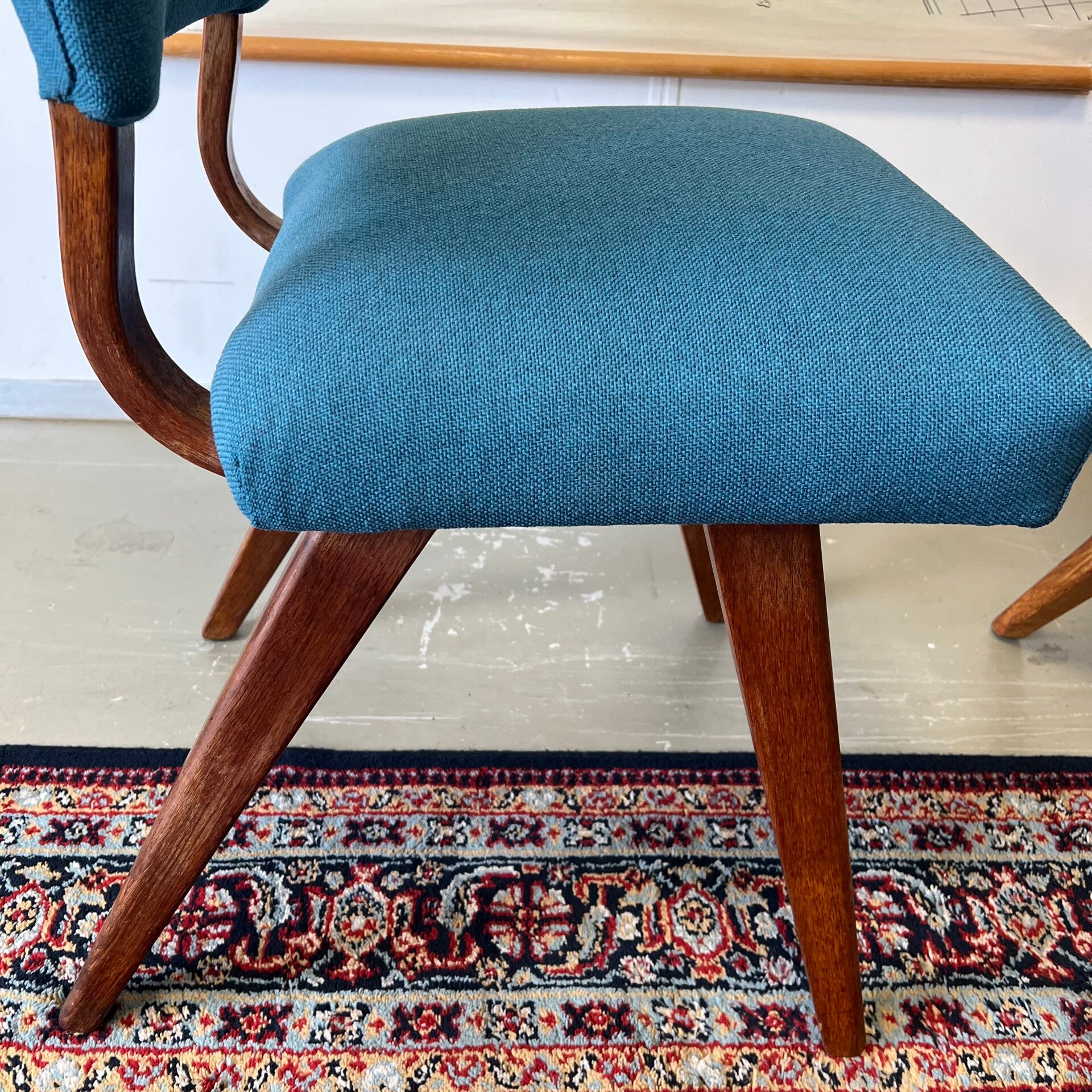 Mooi houten frame met opnieuw gestoffeerde zitting en rugleuning (petrol/blauw).