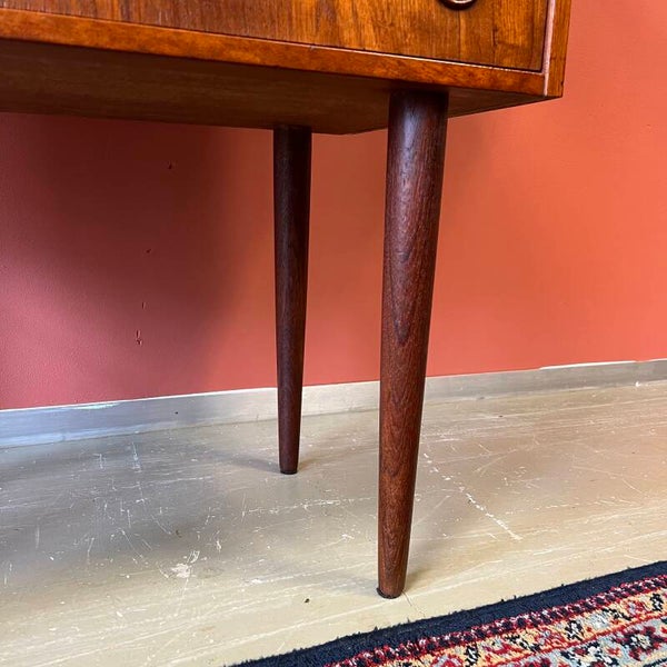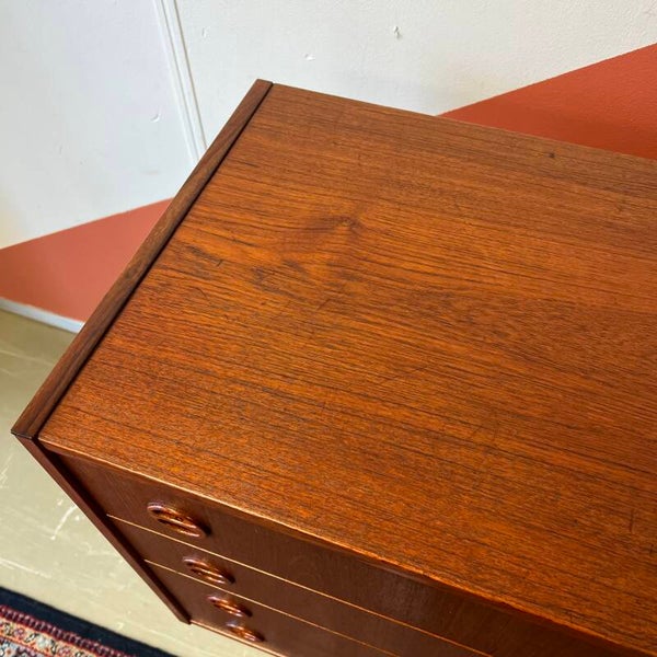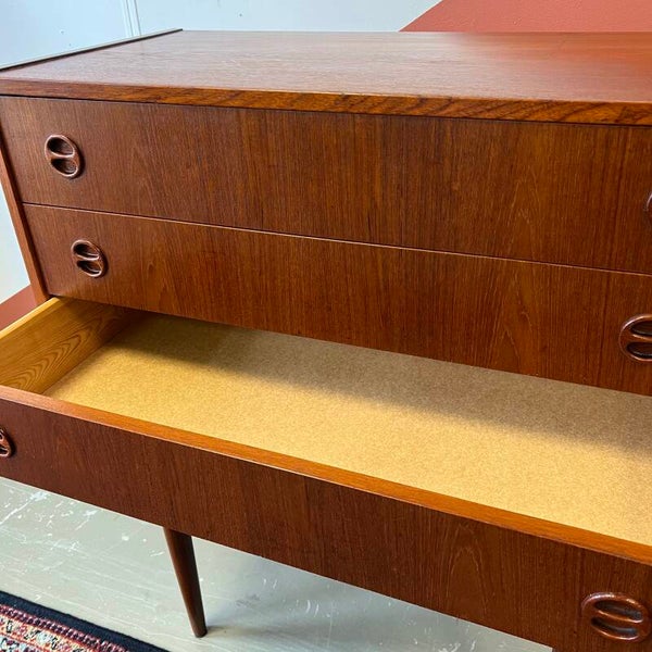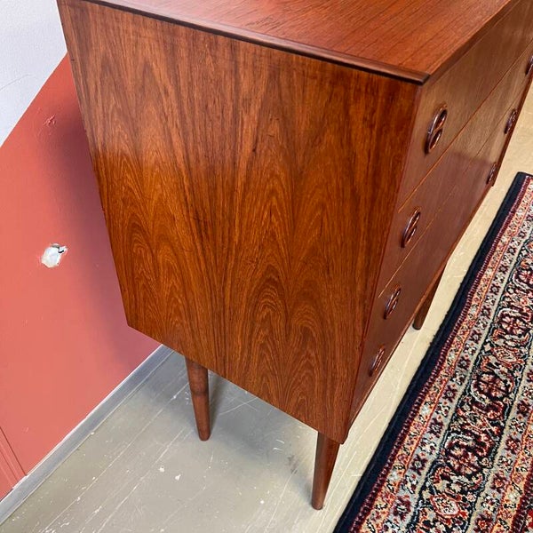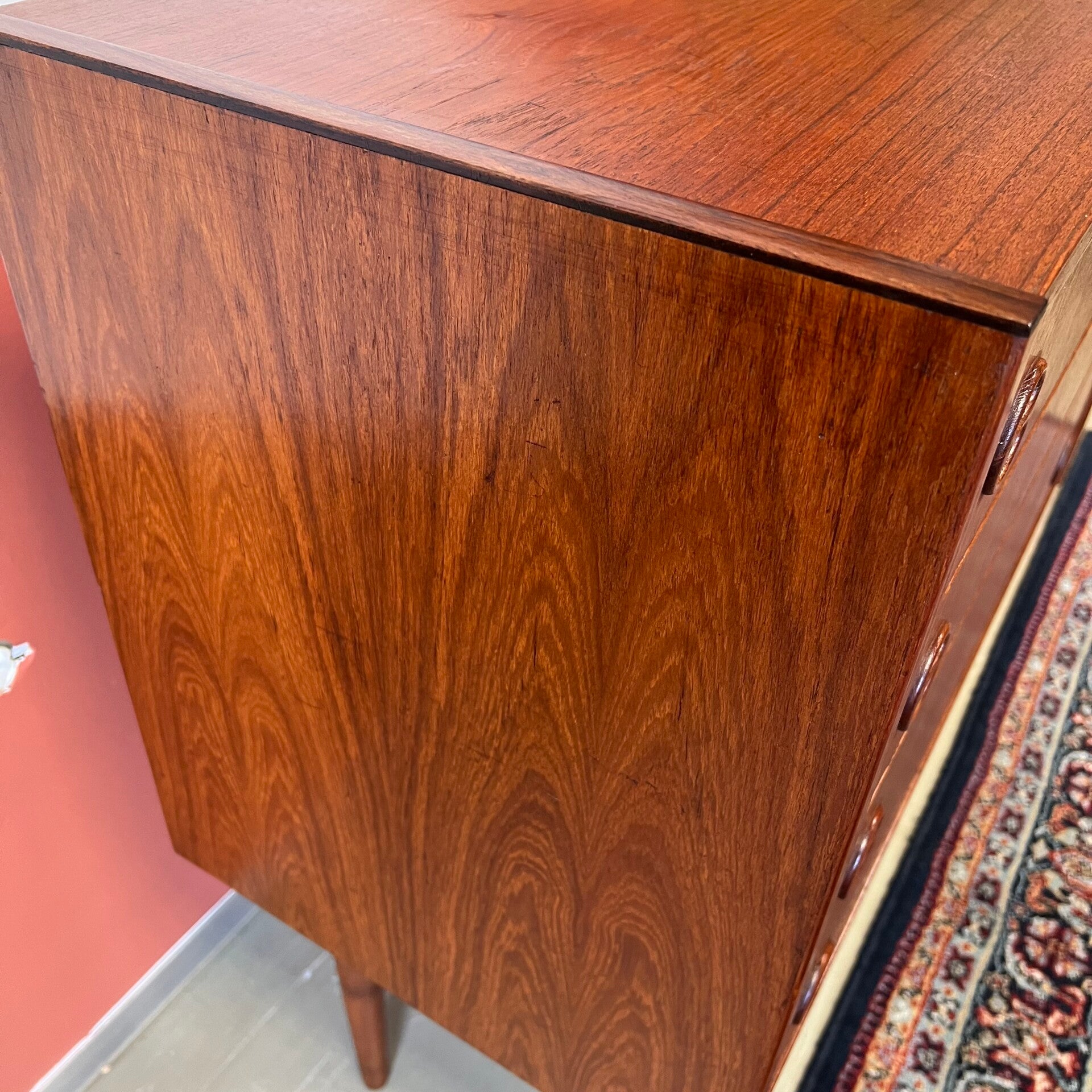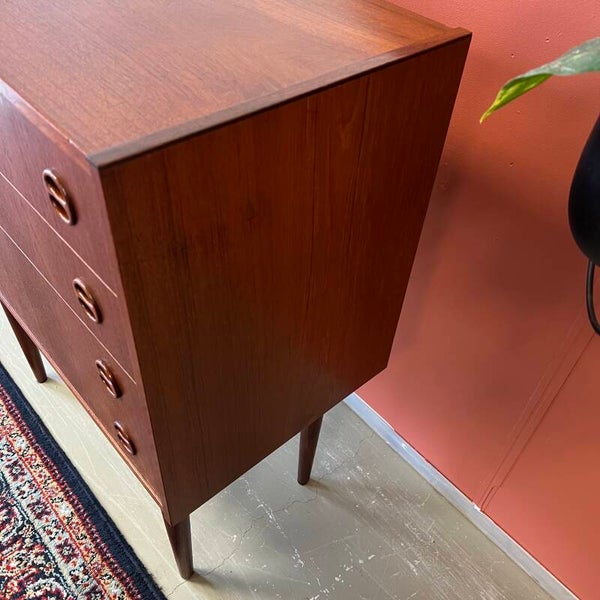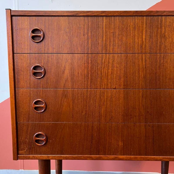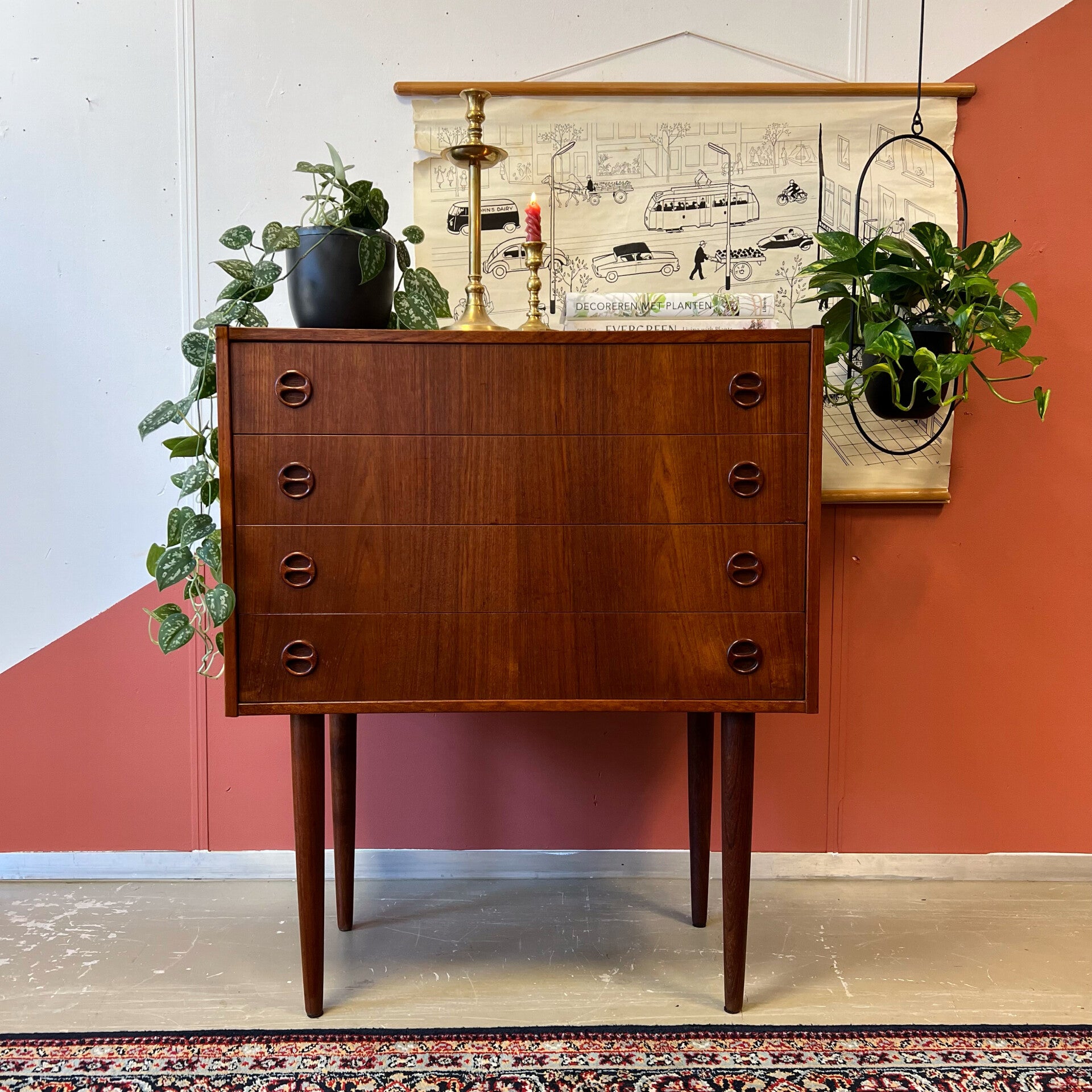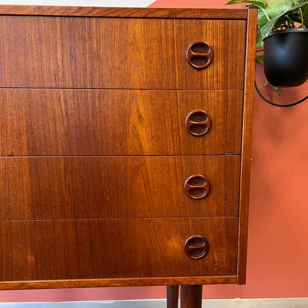 Mooie Deense vintage ladekast met prachtig ingelegde handgrepen en voorzien van hoge conische poten.
