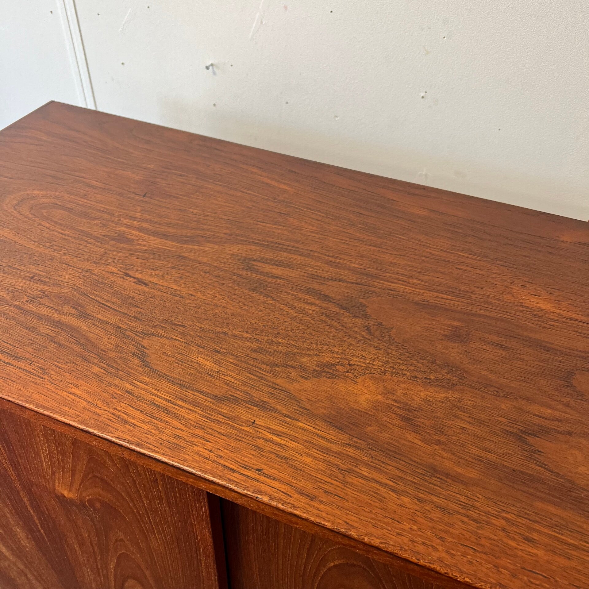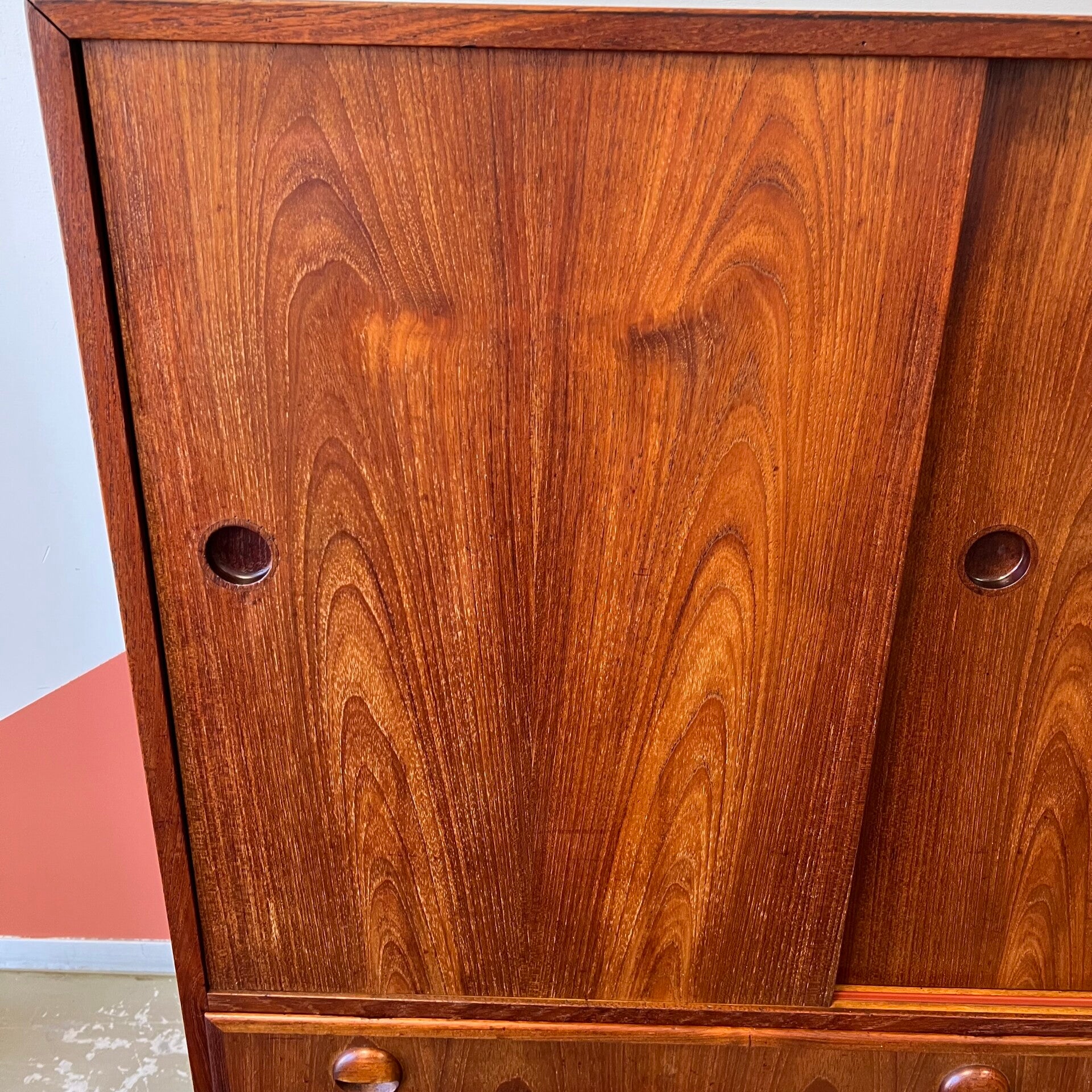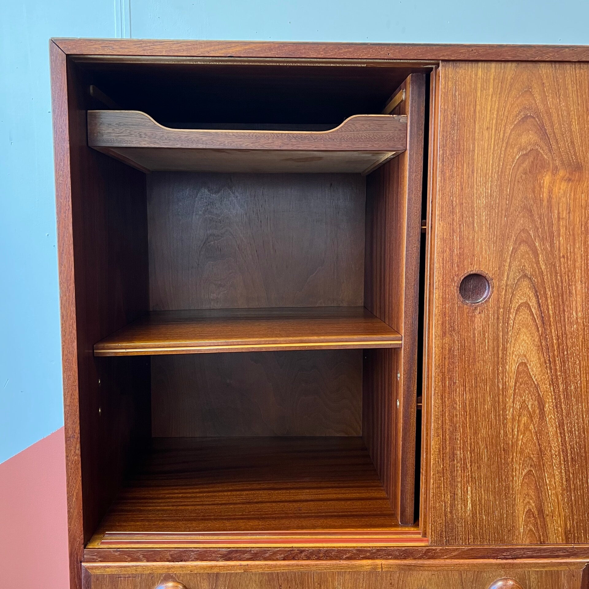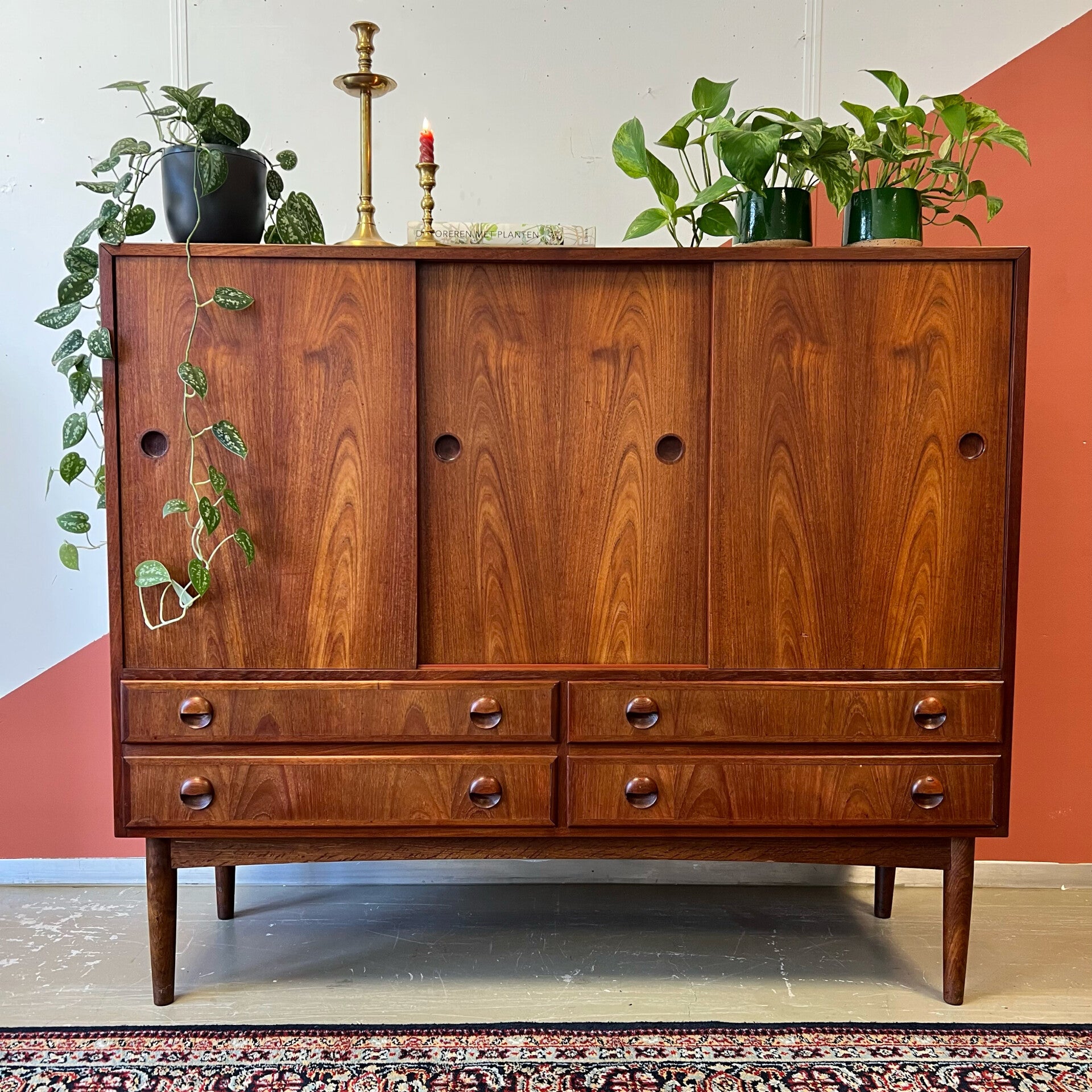 Mooie vintage Deense buffetkast of highboard in teak (fineer), op slanke conische poten.