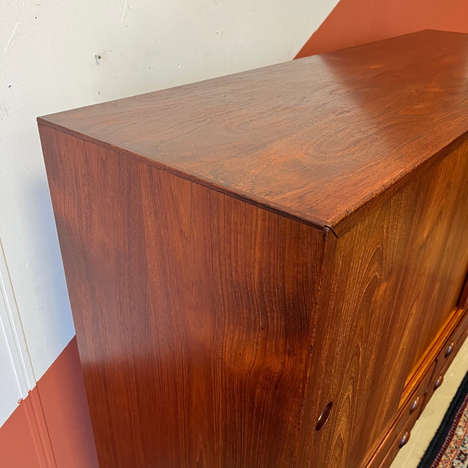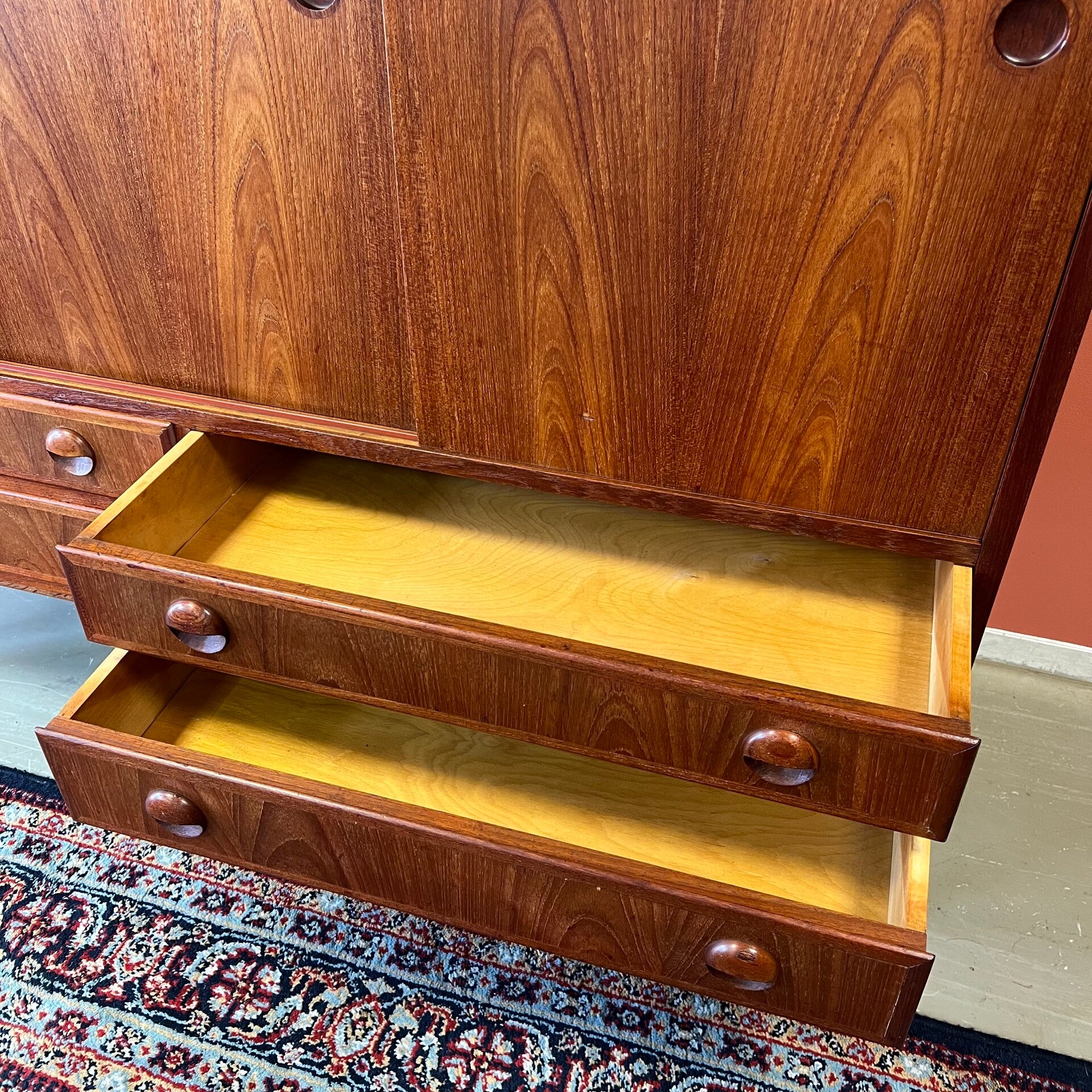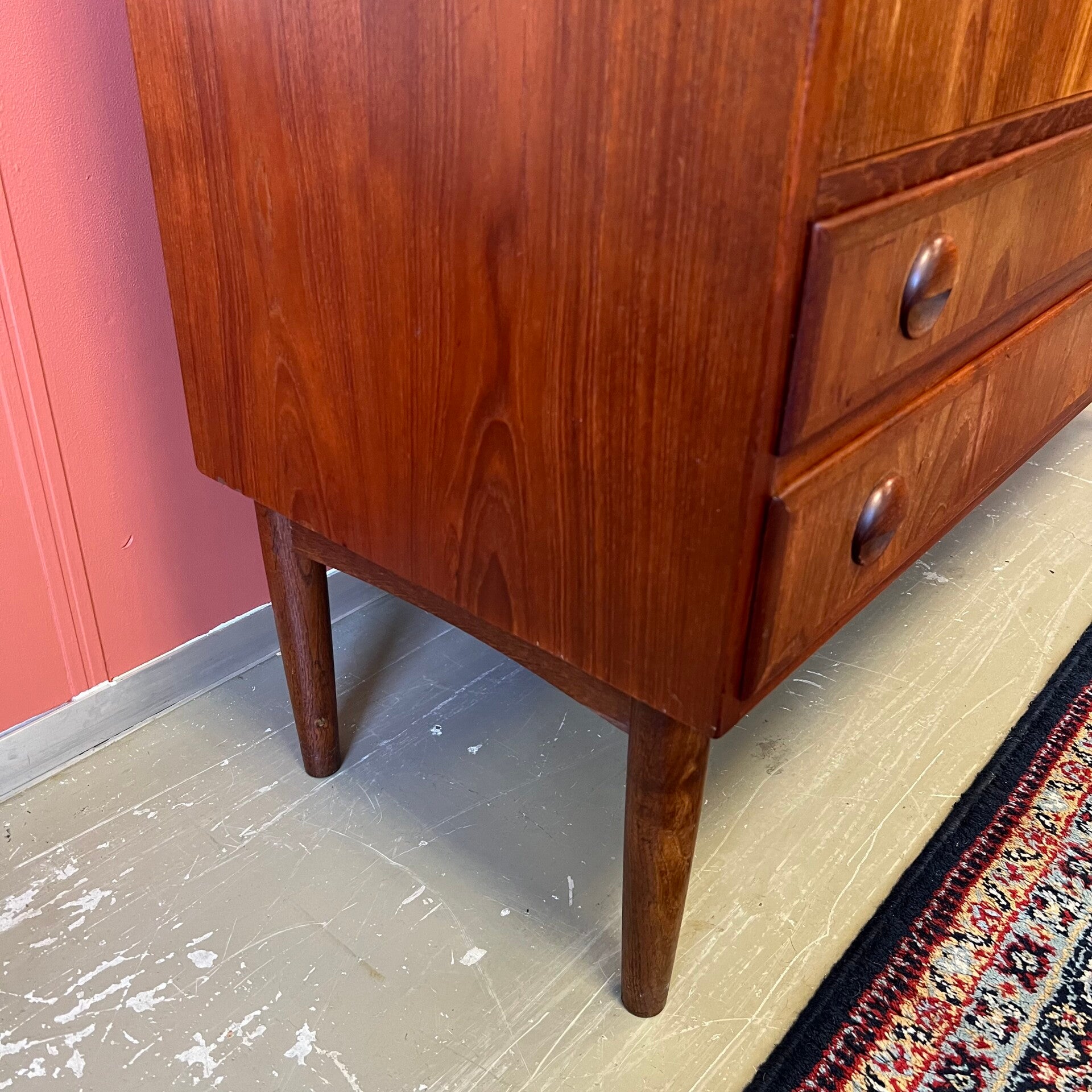 Mooie vintage Deense buffetkast of highboard in teak (fineer), op slanke conische poten.