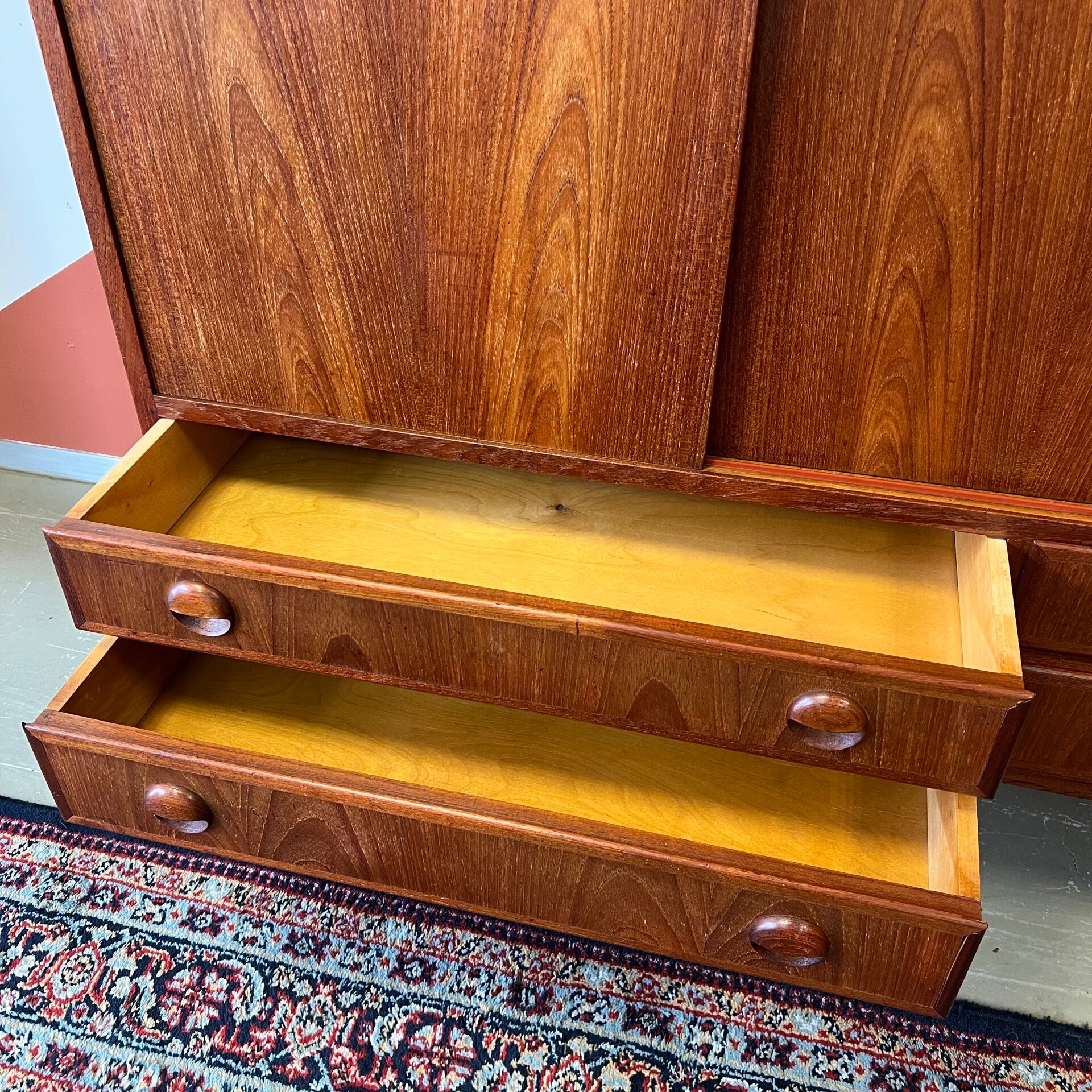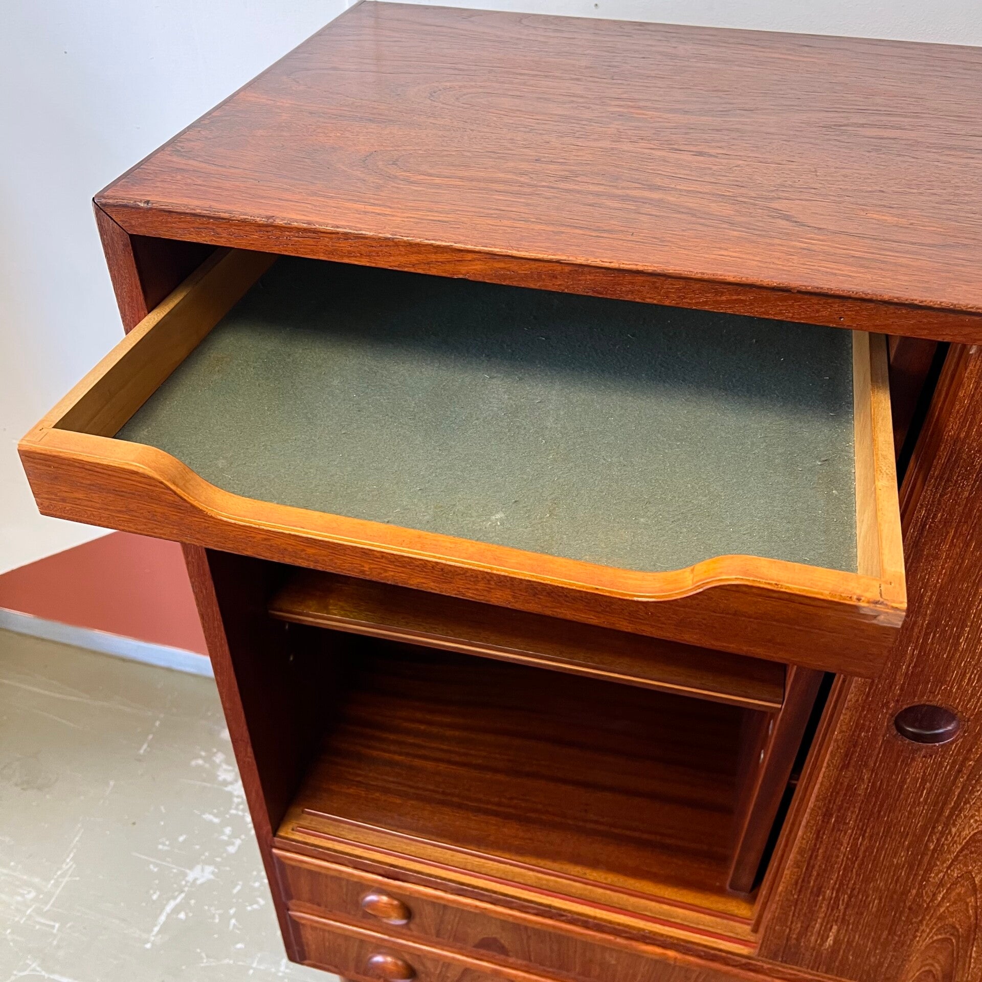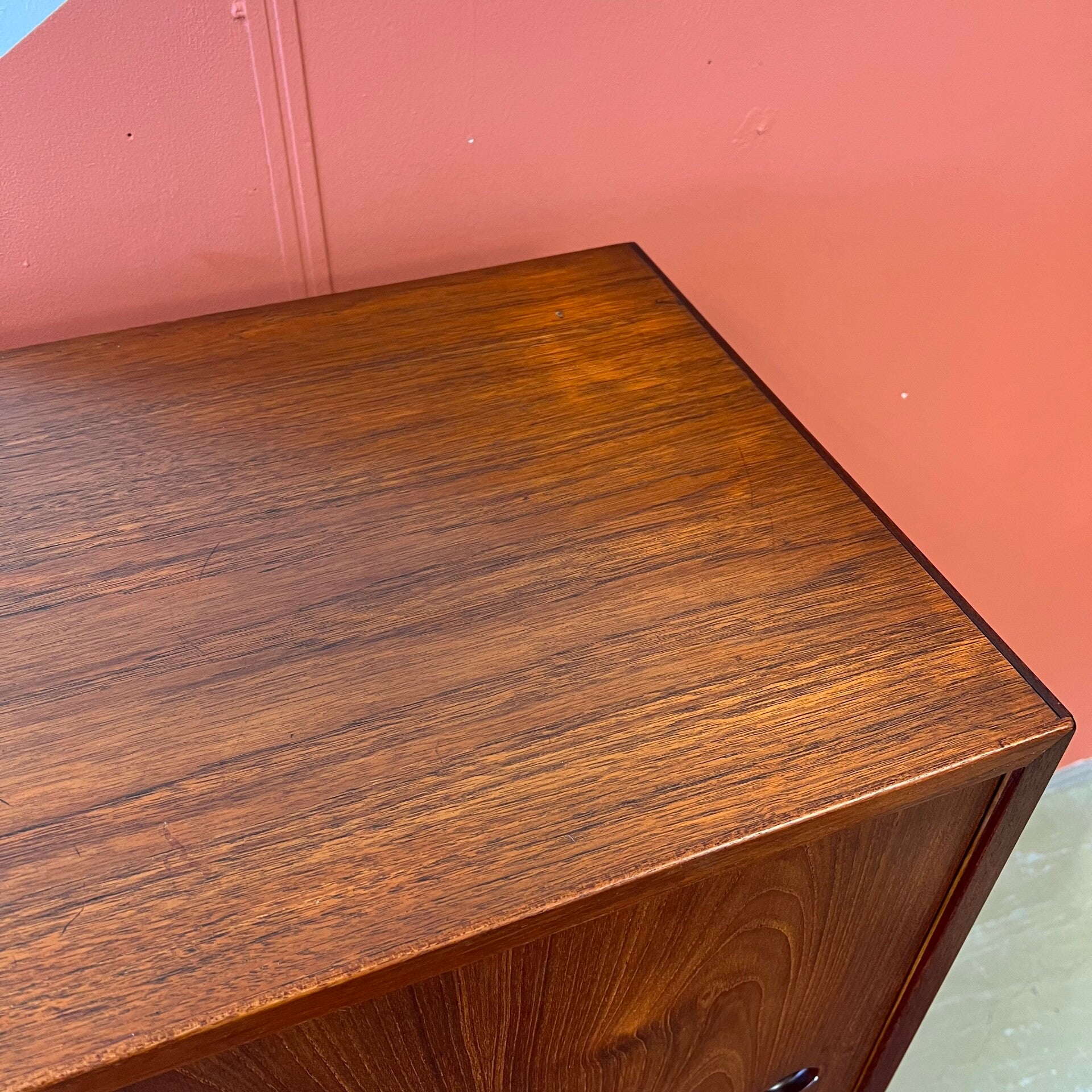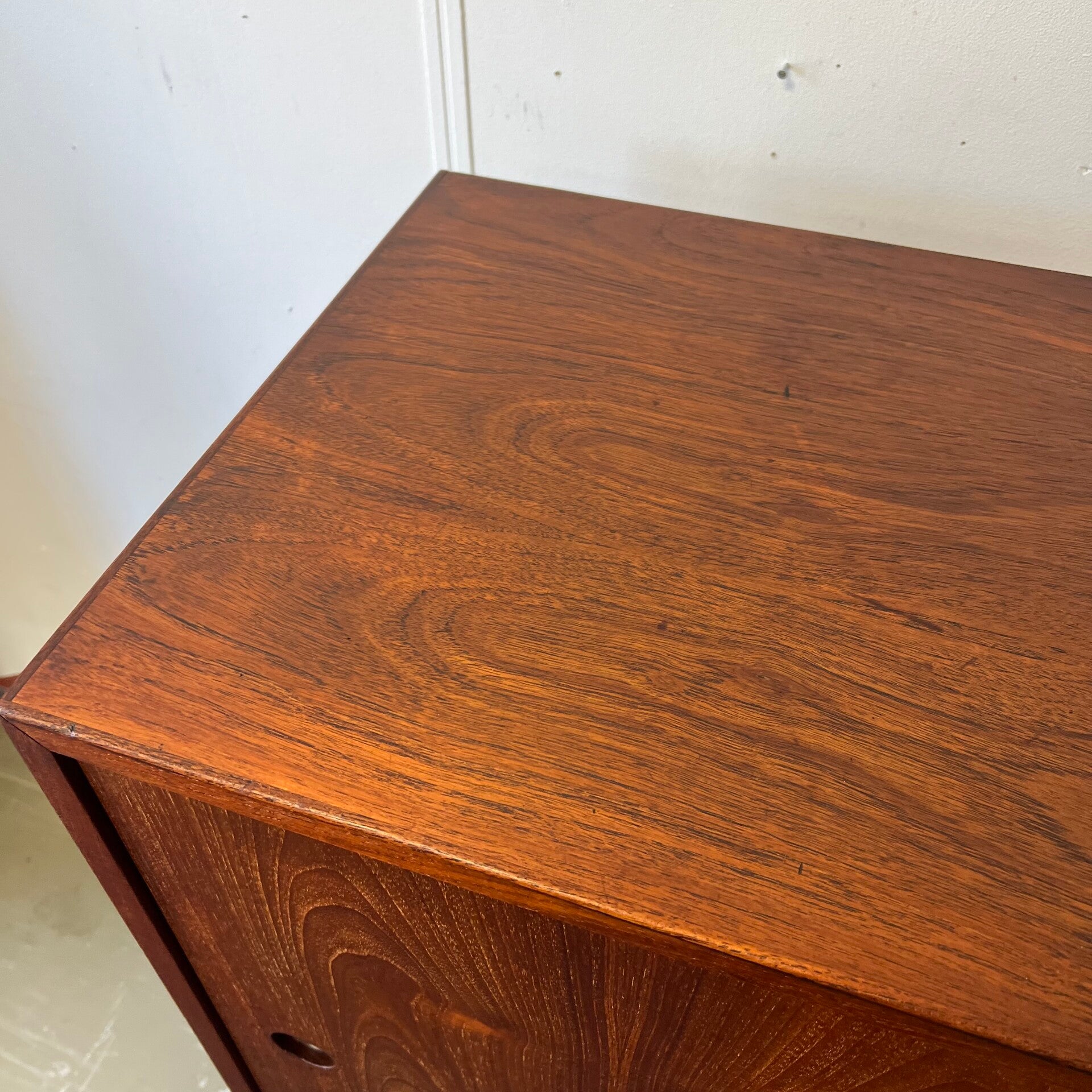 Mooie vintage Deense buffetkast of highboard in teak (fineer), op slanke conische poten.
